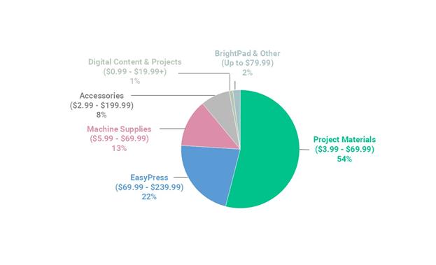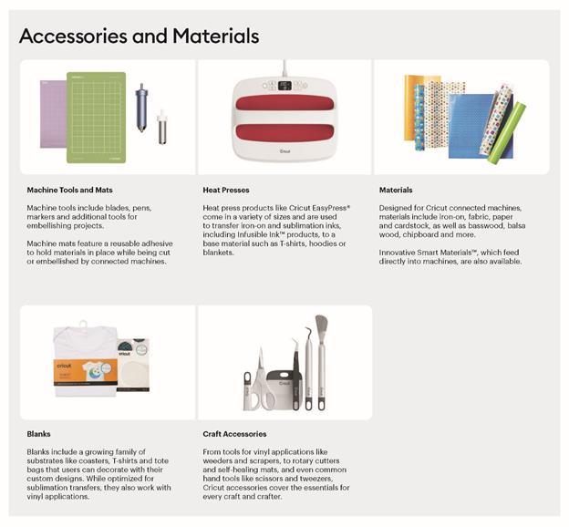 We also sell a broad range of accessories and materials that help bring designs to life, from advanced tools like heat presses to Cricut-branded rulers, scoring tools, pens, paper and iron-on vinyl. These products are designed to work seamlessly and easily with our connected machines, which is why we see many of our users purchase Cricut-branded accessories and materials. Creating projects often drives repeat purchases of accessories and materials for years after a user first buys a connected machine, demonstrating ongoing engagement with our platform.