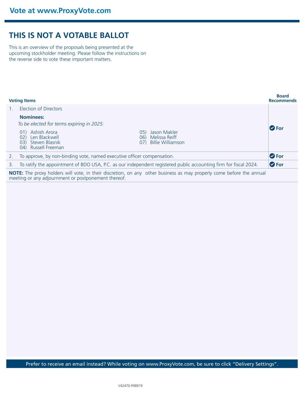 Prefer to receive an email instead? While voting on www.ProxyVote.com, be sure to click “Delivery Settings”. Voting Items Board Recommends V42470-P08919 THIS IS NOT A VOTABLE BALLOT This is an overview of the proposals being presented at the upcoming stockholder meeting. Please follow the instructions on the reverse side to vote these important matters. Vote at www.ProxyVote.com 1. Election of Directors For Nominees: To be elected for terms expiring in 2025: 01) Ashish Arora 02) Len Blackwell 03) Steven Blasnik 04) Russell Freeman 05) Jason Makler 06) Melissa Reiff 07) Billie Williamson 2. To approve, by non-binding vote, named executive officer compensation. For 3. To ratify the appointment of BDO USA, P.C. as our independent registered public accounting firm for fiscal 2024. For NOTE: The proxy holders will vote, in their discretion, on any other business as may properly come before the annual meeting or any adjournment or postponement thereof.