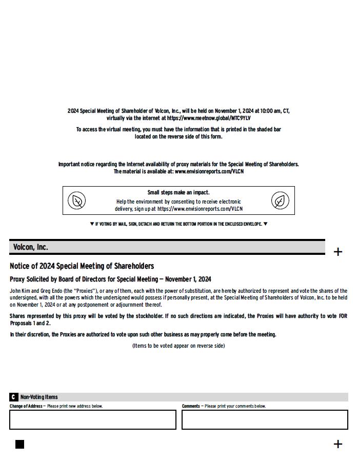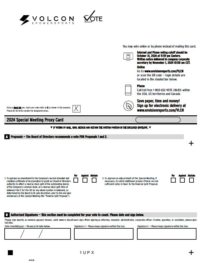 Small steps make an impact. Help the environment by consenting to receive electronic delivery, sign up at https:// www.envisionreports.com/VLCN Notice of 2024 Special Meeting of Shareholders Proxy Solicited by Board of Directors for Special Meeting — November 1, 2024 John Kim and Greg Endo (the “Proxies”), or any of them, each with the power of substitution, are hereby authorized to represent and vote the shares of the undersigned, with all the powers which the undersigned would possess if personally present, at the Special Meeting of Shareholders of Volcon, Inc . to be held on November 1 , 2024 or at any postponement or adjournment thereof . Shares represented by this proxy will be voted by the stockholder . If no such directions are indicated, the Proxies will have authority to vote FOR Proposals 1 and 2 . In their discretion, the Proxies are authorized to vote upon such other business as may properly come before the meeting . (Items to be voted appear on reverse side) Volcon, Inc. T IF VOTING BY MAIL, SIGN, DETACH AND RETURN THE BOTTOM PORTION IN THE ENCLOSED ENVELOPE. T Change of Address — Please print new address below. Comments — Please print your comments below. Non - Voting Items C + + Important notice regarding the Internet availability of proxy materials for the Special Meeting of Shareholders. The material is available at: www.envisionreports.com/VLCN 2024 Special Meeting of Shareholder of Volcon, Inc., will be held on November 1, 2024 at 10:00 am, CT, virtually via the internet at https:// www.meetnow.global/MTC9YLV To access the virtual meeting, you must have the information that is printed in the shaded bar located on the reverse side of this form.
