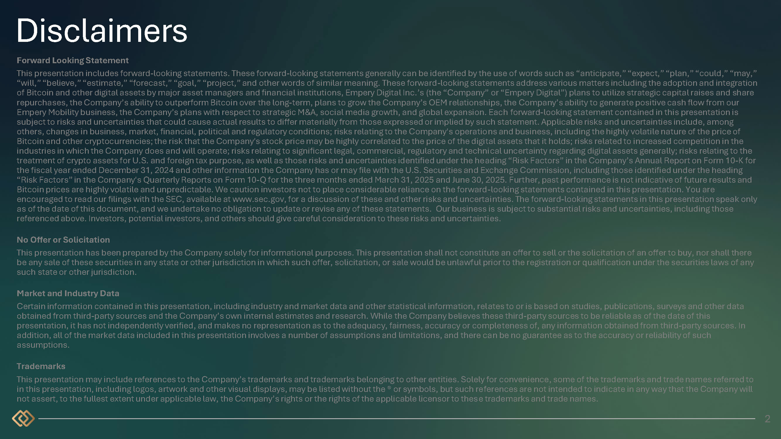 Disclaimers Forward Looking Statement This presentation includes forward - looking statements. These forward - looking statements generally can be identified by the use of words such as “anticipate,” “expect,” “plan,” “could,” “may,” “will,” “believe,” “estimate,” “forecast,” “goal,” “project,” and other words of similar meaning. These forward - looking statements address various matters including the adoption and integration of Bitcoin and other digital assets by major asset managers and financial institutions, Empery Digital Inc.’s (the “Company” or “Empery Digital”) plans to utilize strategic capital raises and share repurchases, the Company’s ability to outperform Bitcoin over the long - term, plans to grow the Company’s OEM relationships, the Company’s ability to generate positive cash flow from our Empery Mobility business, the Company’s plans with respect to strategic M&A, social media growth, and global expansion. Each forward - looking statement contained in this presentation is subject to risks and uncertainties that could cause actual results to differ materially from those expressed or implied by such statement. Applicable risks and uncertainties include, among others, changes in business, market, financial, political and regulatory conditions; risks relating to the Company's operations and business, including the highly volatile nature of the price of Bitcoin and other cryptocurrencies; the risk that the Company's stock price may be highly correlated to the price of the digital assets that it holds; risks related to increased competition in the industries in which the Company does and will operate; risks relating to significant legal, commercial, regulatory and technical uncertainty regarding digital assets generally; risks relating to the treatment of crypto assets for U.S. and foreign tax purpose, as well as those risks and uncertainties identified under the heading “Risk Factors” in the Company’s Annual Report on Form 10 - K for the fiscal year ended December 31, 2024 and other information the Company has or may file with the U.S. Securities and Exchange Commission, including those identified under the heading “Risk Factors” in the Company's Quarterly Reports on Form 10 - Q for the three months ended March 31, 2025 and June 30, 2025. Further, past performance is not indicative of future results and Bitcoin prices are highly volatile and unpredictable. We caution investors not to place considerable reliance on the forward - looking statements contained in this presentation. You are encouraged to read our filings with the SEC, available at www.sec.gov, for a discussion of these and other risks and uncertainties. The forward - looking statements in this presentation speak only as of the date of this document, and we undertake no obligation to update or revise any of these statements. Our business is subject to substantial risks and uncertainties, including those referenced above. Investors, potential investors, and others should give careful consideration to these risks and uncertainties. No Offer or Solicitation This presentation has been prepared by the Company solely for informational purposes . This presentation shall not constitute an offer to sell or the solicitation of an offer to buy, nor shall there be any sale of these securities in any state or other jurisdiction in which such offer, solicitation, or sale would be unlawful prior to the registration or qualification under the securities laws of any such state or other jurisdiction . Market and Industry Data Certain information contained in this presentation, including industry and market data and other statistical information, relates to or is based on studies, publications, surveys and other data obtained from third - party sources and the Company’s own internal estimates and research. While the Company believes these third - party sources to be reliable as of the date of this presentation, it has not independently verified, and makes no representation as to the adequacy, fairness, accuracy or completeness of, any information obtained from third - party sources. In addition, all of the market data included in this presentation involves a number of assumptions and limitations, and there can be no guarantee as to the accuracy or reliability of such assumptions. Trademarks This presentation may include references to the Company’s trademarks and trademarks belonging to other entities . Solely for convenience, some of the trademarks and trade names referred to in this presentation, including logos, artwork and other visual displays, may be listed without the ® or symbols, but such references are not intended to indicate in any way that the Company will not assert, to the fullest extent under applicable law, the Company’s rights or the rights of the applicable licensor to these trademarks and trade names . 2