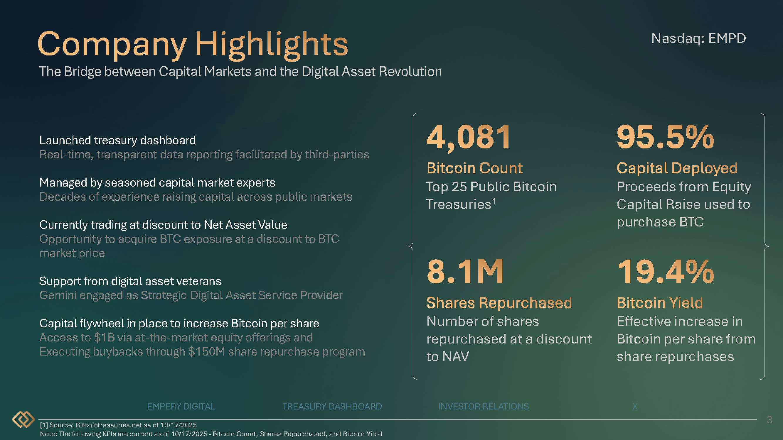 3 The Bridge between Capital Markets and the Digital Asset Revolution I NVESTOR RELATIONS X Launched treasury dashboard Real - time, transparent data reporting facilitated by third - parties Managed by seasoned capital market experts Decades of experience raising capital across public markets Currently trading at discount to Net Asset Value Opportunity to acquire BTC exposure at a discount to BTC market price Support from digital asset veterans Gemini engaged as Strategic Digital Asset Service Provider Capital flywheel in place to increase Bitcoin per share Access to $1B via at - the - market equity offerings and Executing buybacks through $150M share repurchase program Top 25 Public Bitcoin Treasuries 1 Proceeds from Equity Capital Raise used to purchase BTC Number of shares repurchased at a discount to NAV Effective increase in Bitcoin per share from share repurchases EMPERY DIGITAL TREASURY DASHBOARD [1] Source: Bitcointreasuries.net as of 10/17/2025 Note: The following KPIs are current as of 10/17/2025 - Bitcoin Count, Shares Repurchased, and Bitcoin Yield Nasdaq: EMPD