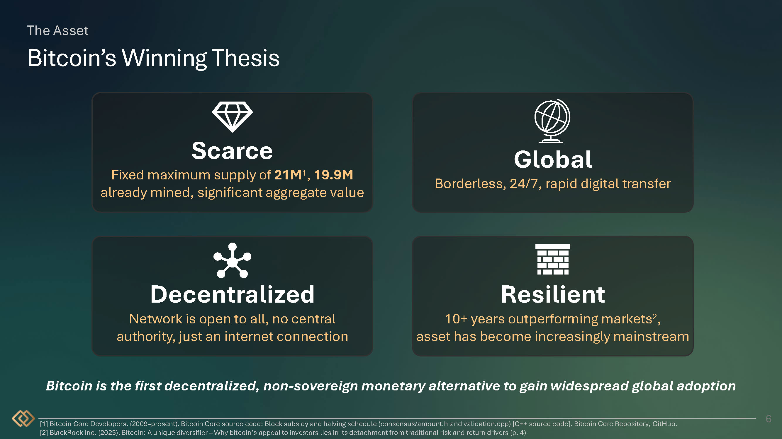 Scarce Fixed maximum supply of 21M 1 , 19.9M already mined, significant aggregate value The Asset Bitcoin’s Winning Thesis 6 Global Borderless, 24/7, rapid digital transfer Decentralized Network is open to all, no central authority, just an internet connection Resilient 10+ years outperforming markets 2 , asset has become increasingly mainstream Bitcoin is the first decentralized, non - sovereign monetary alternative to gain widespread global adoption 1 Bitcoin Core Developers. (2009 – present). Bitcoin Core source code: Block subsidy and halving schedule (consensus/amount.h and validation.cpp) [C++ source code]. Bitcoin Core Repository, GitHub. 2 BlackRock Inc. (2025). Bitcoin: A unique diversifier – Why bitcoin’s appeal to investors lies in its detachment from traditional risk and return drivers (p. 4)