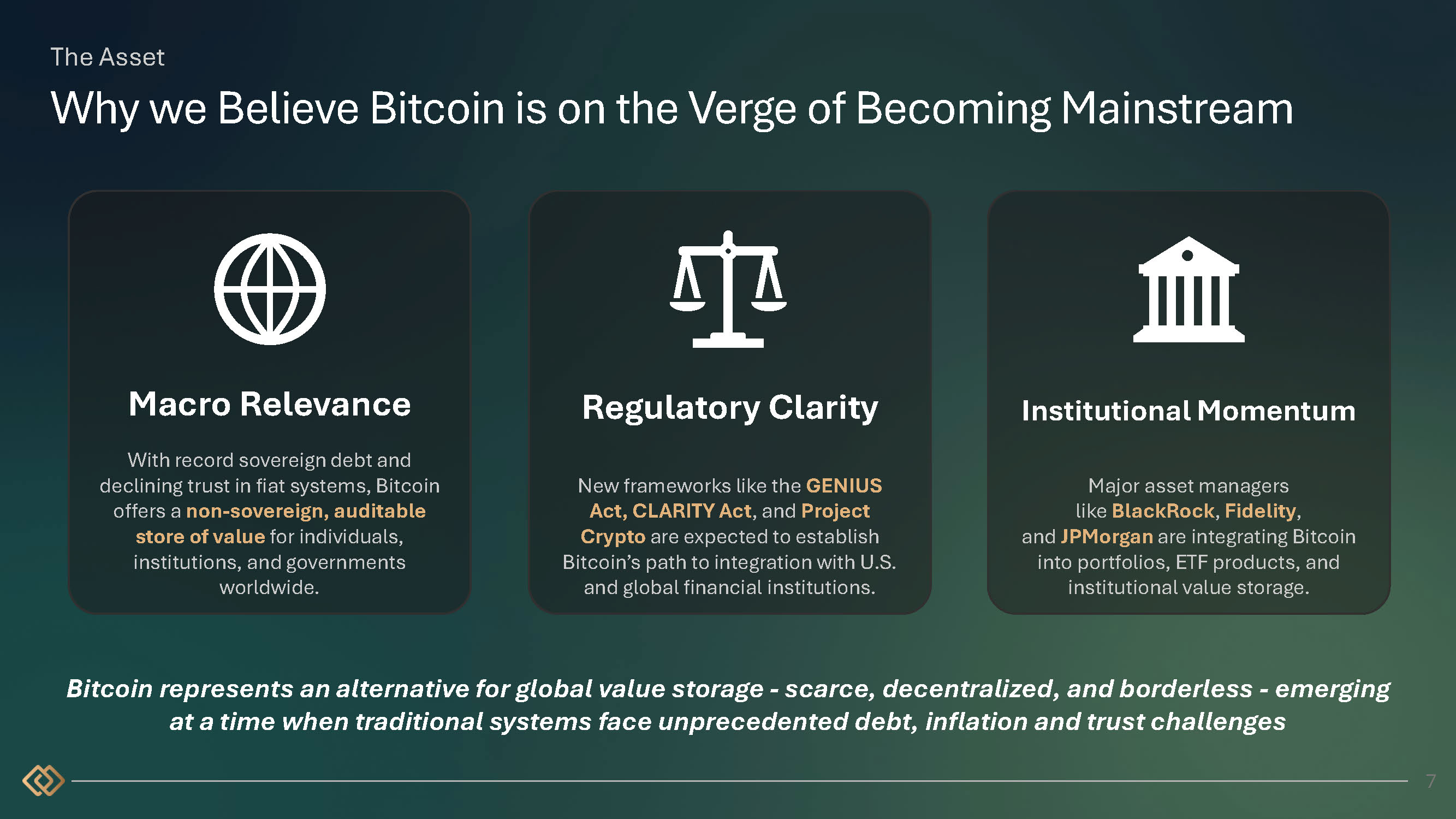 The Asset Why we Believe Bitcoin is on the Verge of Becoming Mainstream Regulatory Clarity New frameworks like the GENIUS Act, CLARITY Act , and Project Crypto are expected to establish Bitcoin’s path to integration with U.S. and global financial institutions. Institutional Momentum Major asset managers like BlackRock , Fidelity , and JPMorgan are integrating Bitcoin into portfolios, ETF products, and institutional value storage. Bitcoin represents an alternative for global value storage - scarce, decentralized, and borderless - emerging at a time when traditional systems face unprecedented debt, inflation and trust challenges 7 Macro Relevance With record sovereign debt and declining trust in fiat systems, Bitcoin offers a non - sovereign, auditable store of value for individuals, institutions, and governments worldwide.