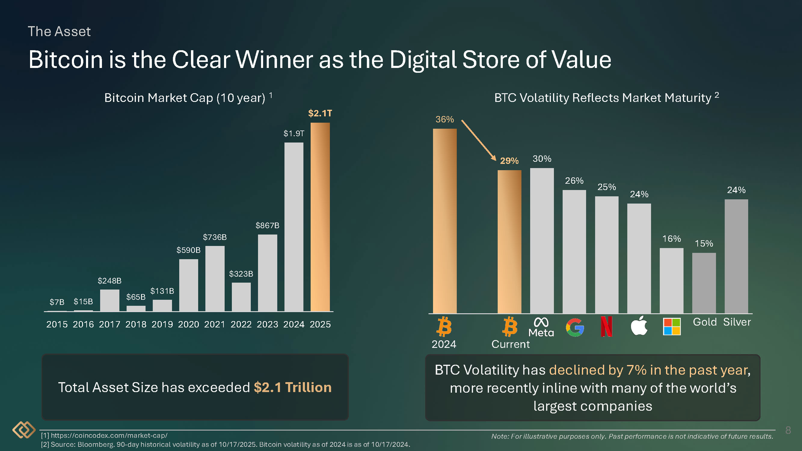 $248B $65B $131B $736B $590B $323B $867B $1.9T $2.1T $7B $15B 2015 2016 2017 2018 2019 2020 2021 2022 2023 2024 2025 The Asset Bitcoin is the Clear Winner as the Digital Store of Value 8 1 https://coincodex.com/market - cap/ 2 Source: Bloomberg. 90 - day historical volatility as of 10/17/2025. Bitcoin volatility as of 2024 is as of 10/17/2024. Bitcoin Market Cap (10 year) 1 BTC Volatility Reflects Market Maturity 2 36% 29% 30% 26% 25% 24% 16% 15% 24% Gold Silver Total Asset Size has exceeded $2.1 Trillion 2024 Current BTC Volatility has declined by 7% in the past year , more recently inline with many of the world’s largest companies Note: For illustrative purposes only. Past performance is not indicative of future results.