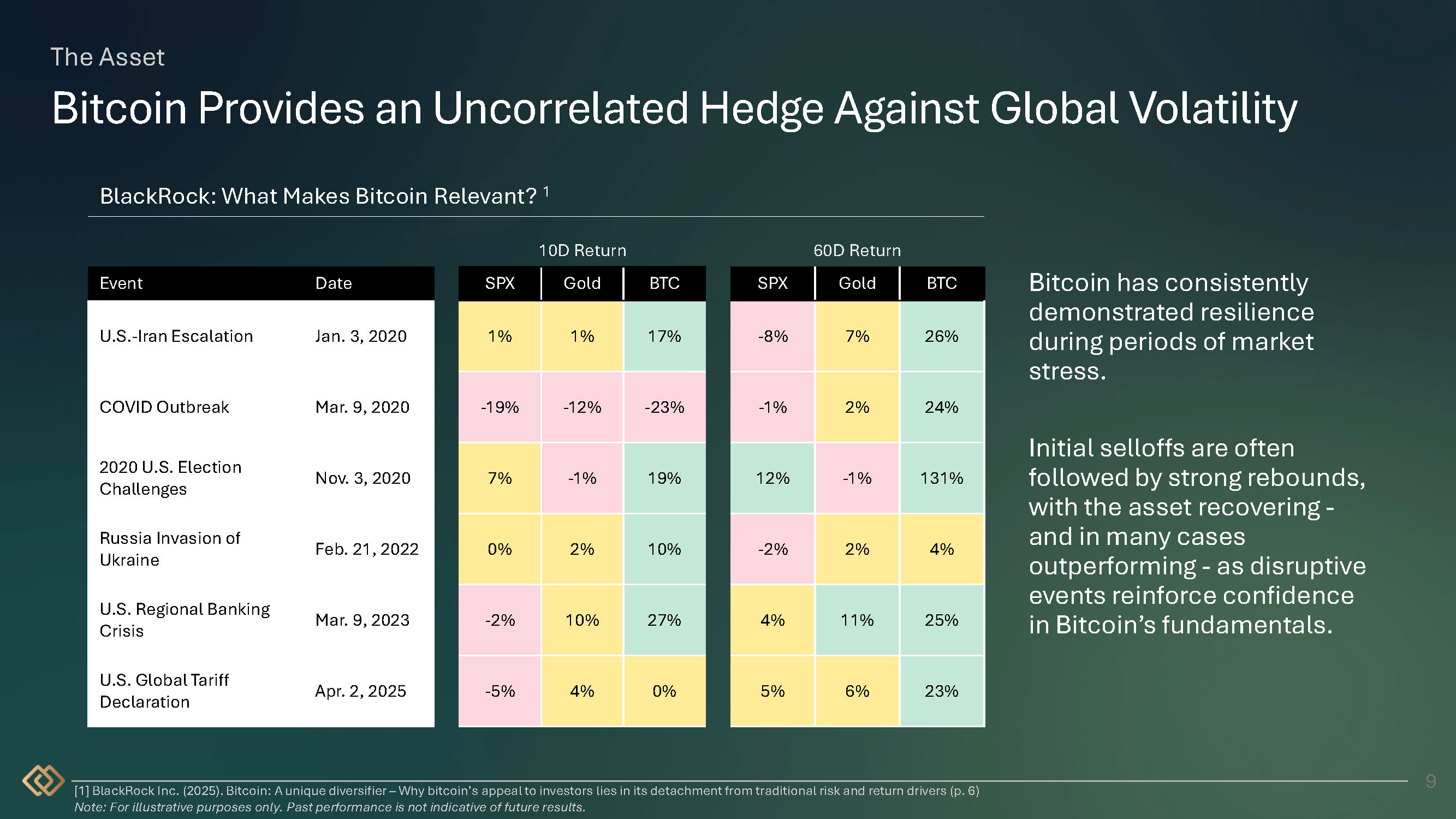 The Asset Bitcoin Provides an Uncorrelated Hedge Against Global Volatility 9 Date Event Jan. 3, 2020 U.S. - Iran Escalation Mar. 9, 2020 COVID Outbreak Nov. 3, 2020 2020 U.S. Election Challenges Feb. 21, 2022 Russia Invasion of Ukraine Mar. 9, 2023 U.S. Regional Banking Crisis Apr. 2, 2025 U.S. Global Tariff Declaration BTC Gold SPX 17% 1% 1% - 23% - 12% - 19% 19% - 1% 7% 10% 2% 0% 27% 10% - 2% 0% 4% - 5% BTC Gold SPX 26% 7% - 8% 24% 2% - 1% 131% - 1% 12% 4% 2% - 2% 25% 11% 4% 23% 6% 5% [1] BlackRock Inc. (2025). Bitcoin: A unique diversifier – Why bitcoin’s appeal to investors lies in its detachment from traditional risk and return drivers (p. 6) Note: For illustrative purposes only. Past performance is not indicative of future results. BlackRock: What Makes Bitcoin Relevant? 1 10D Return 60D Return Bitcoin has consistently demonstrated resilience during periods of market stress . Initial selloffs are often followed by strong rebounds, with the asset recovering - and in many cases outperforming - as disruptive events reinforce confidence in Bitcoin’s fundamentals.