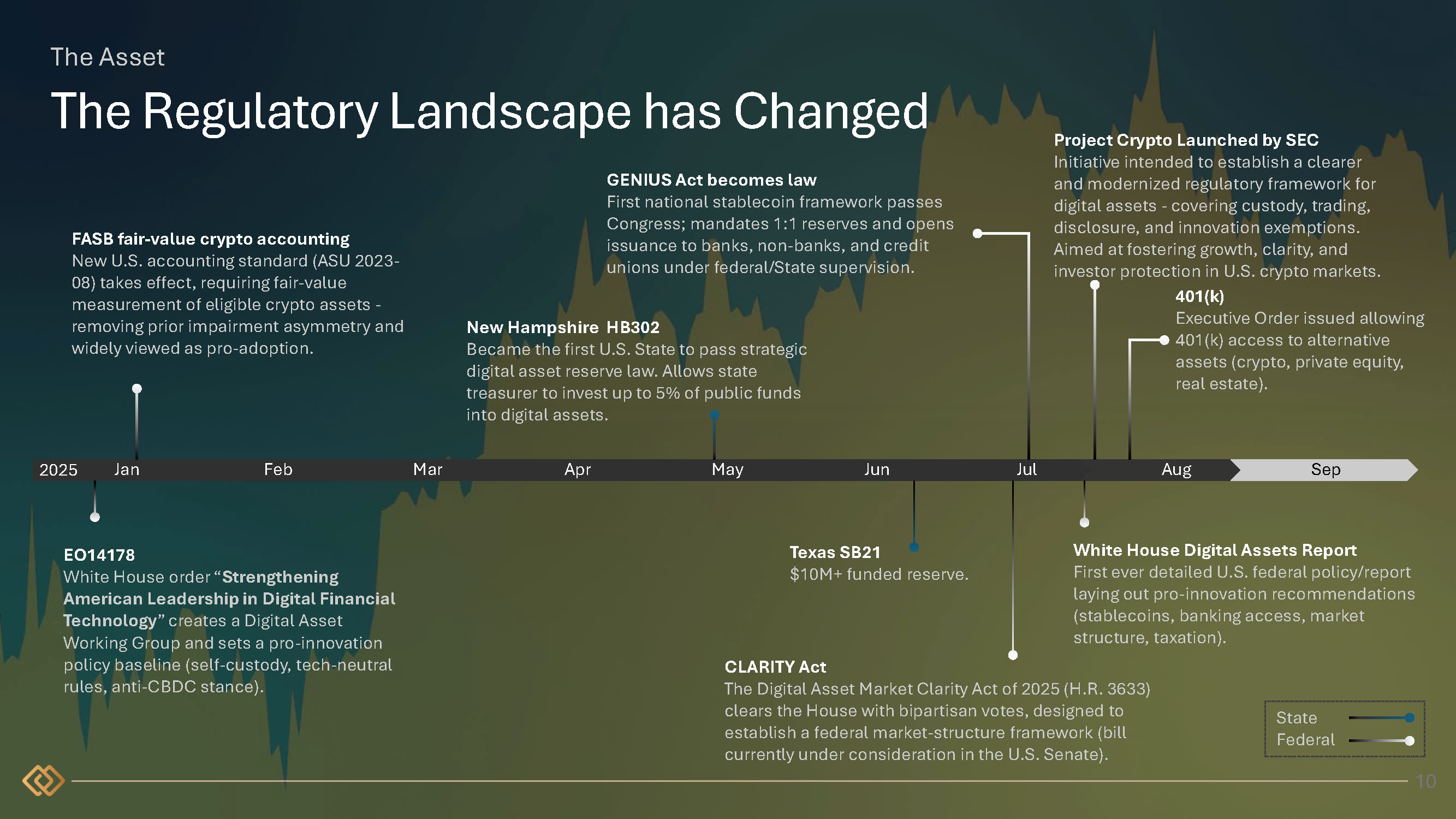 The Asset Feb Mar Jun Jul Aug Sep EO14178 White House order “ Strengthening American Leadership in Digital Financial Technology ” creates a Digital Asset Working Group and sets a pro - innovation policy baseline (self - custody, tech - neutral rules, anti - CBDC stance). FASB fair - value crypto accounting New U.S. accounting standard (ASU 2023 - 08) takes effect, requiring fair - value measurement of eligible crypto assets - removing prior impairment asymmetry and widely viewed as pro - adoption. The Regulatory Landscape has Changed GENIUS Act becomes law First national stablecoin framework passes Congress; mandates 1:1 reserves and opens issuance to banks, non - banks, and credit unions under federal/State supervision. CLARITY Act The Digital Asset Market Clarity Act of 2025 (H.R. 3633) clears the House with bipartisan votes, designed to establish a federal market - structure framework (bill currently under consideration in the U.S. Senate). White House Digital Assets Report First ever detailed U.S. federal policy/report laying out pro - innovation recommendations (stablecoins, banking access, market structure, taxation). New Hampshire HB302 Became the first U.S. State to pass strategic digital asset reserve law. Allows state treasurer to invest up to 5% of public funds into digital assets. Apr May Texas SB21 $10M+ funded reserve. State Federal Project Crypto Launched by SEC Initiative intended to establish a clearer and modernized regulatory framework for digital assets - covering custody, trading, disclosure, and innovation exemptions. Aimed at fostering growth, clarity, and investor protection in U.S. crypto markets. 401(k) Executive Order issued allowing 401(k) access to alternative assets (crypto, private equity, real estate). 2025 Jan 10