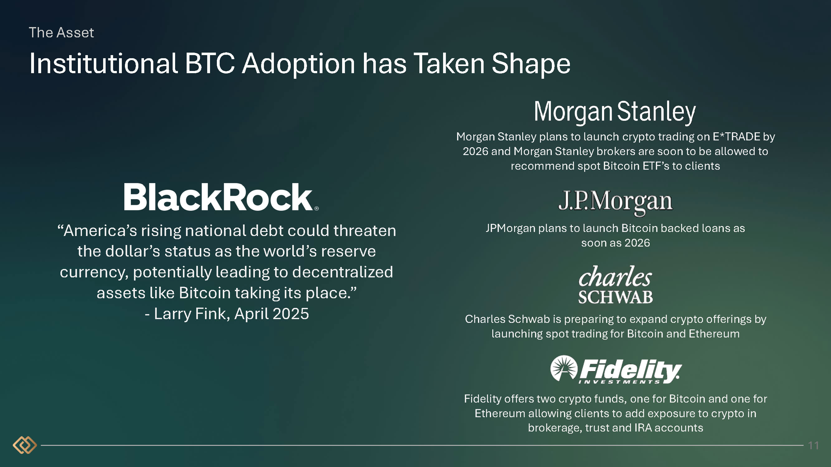 The Asset Institutional BTC Adoption has Taken Shape “America’s rising national debt could threaten the dollar’s status as the world’s reserve currency, potentially leading to decentralized assets like Bitcoin taking its place.” - Larry Fink, April 2025 Morgan Stanley plans to launch crypto trading on E*TRADE by 2026 and Morgan Stanley brokers are soon to be allowed to recommend spot Bitcoin ETF’s to clients JPMorgan plans to launch Bitcoin backed loans as soon as 2026 Charles Schwab is preparing to expand crypto offerings by launching spot trading for Bitcoin and Ethereum Fidelity offers two crypto funds, one for Bitcoin and one for Ethereum allowing clients to add exposure to crypto in brokerage, trust and IRA accounts 11