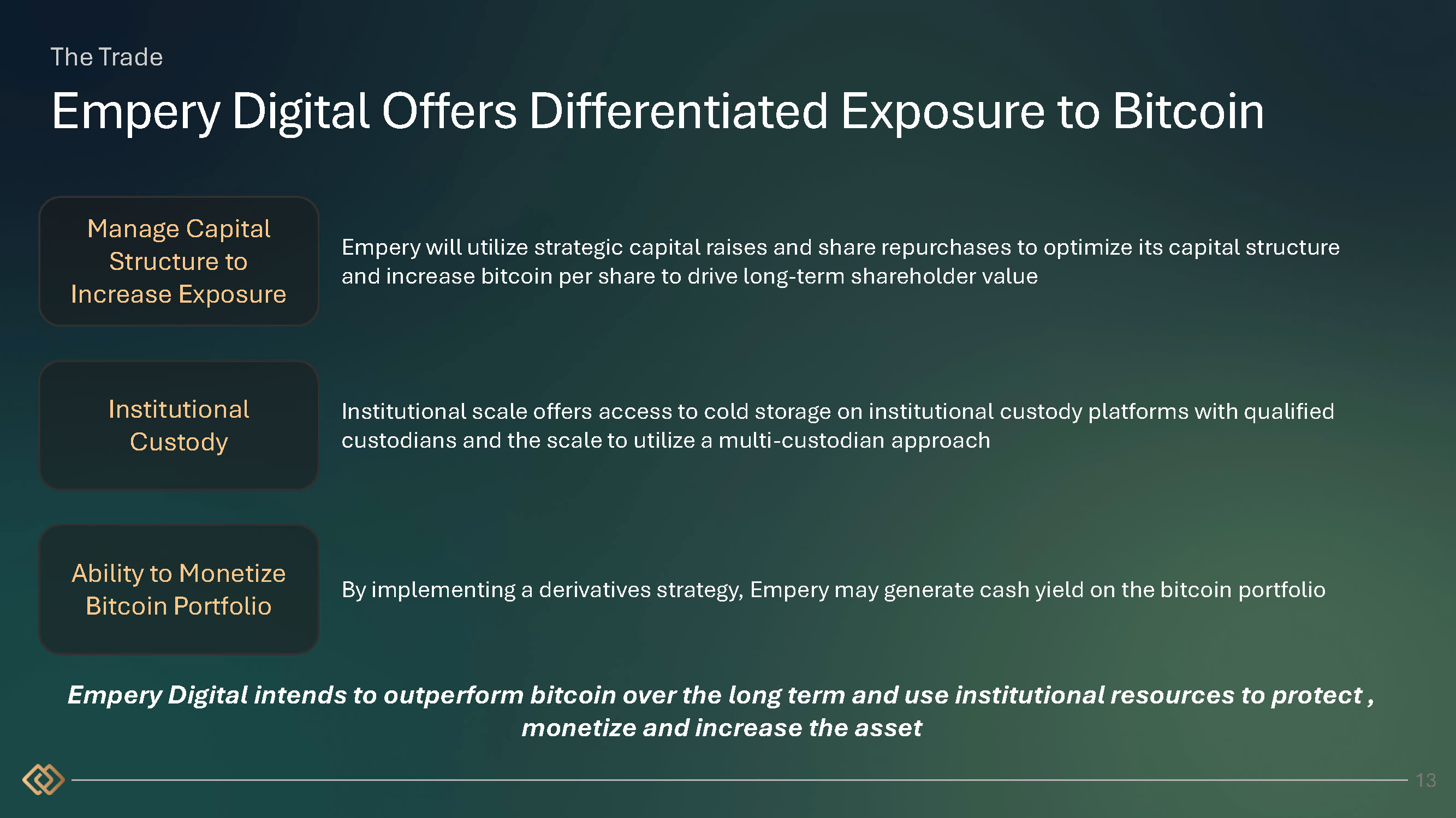 The Trade Empery Digital Offers Differentiated Exposure to Bitcoin Empery will utilize strategic capital raises and share repurchases to optimize its capital structure and increase bitcoin per share to drive long - term shareholder value Empery Digital intends to outperform bitcoin over the long term and use institutional resources to protect , monetize and increase the asset Manage Capital Structure to Increase Exposure Institutional Custody Ability to Monetize Bitcoin Portfolio 13 Institutional scale offers access to cold storage on institutional custody platforms with qualified custodians and the scale to utilize a multi - custodian approach By implementing a derivatives strategy, Empery may generate cash yield on the bitcoin portfolio