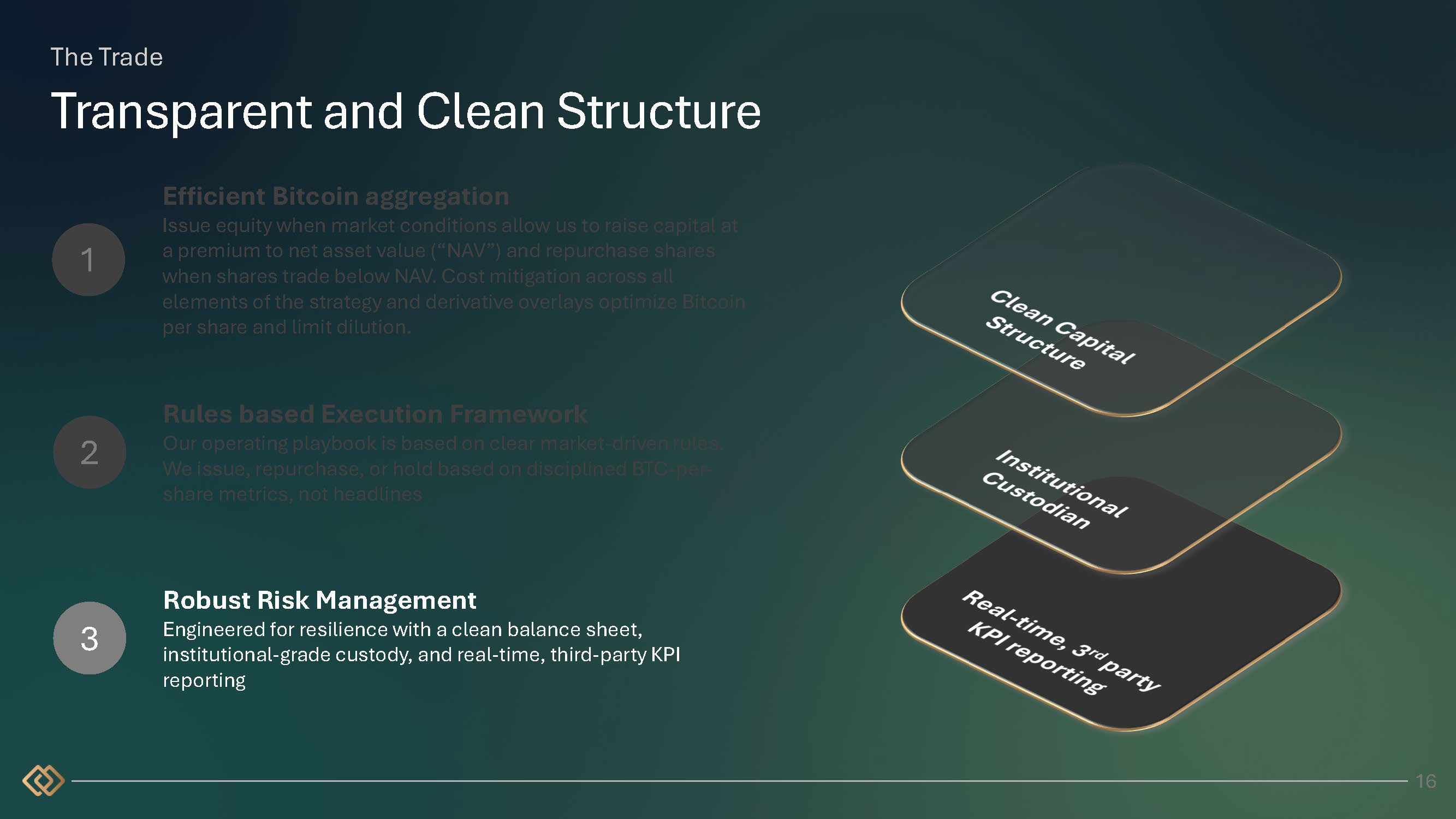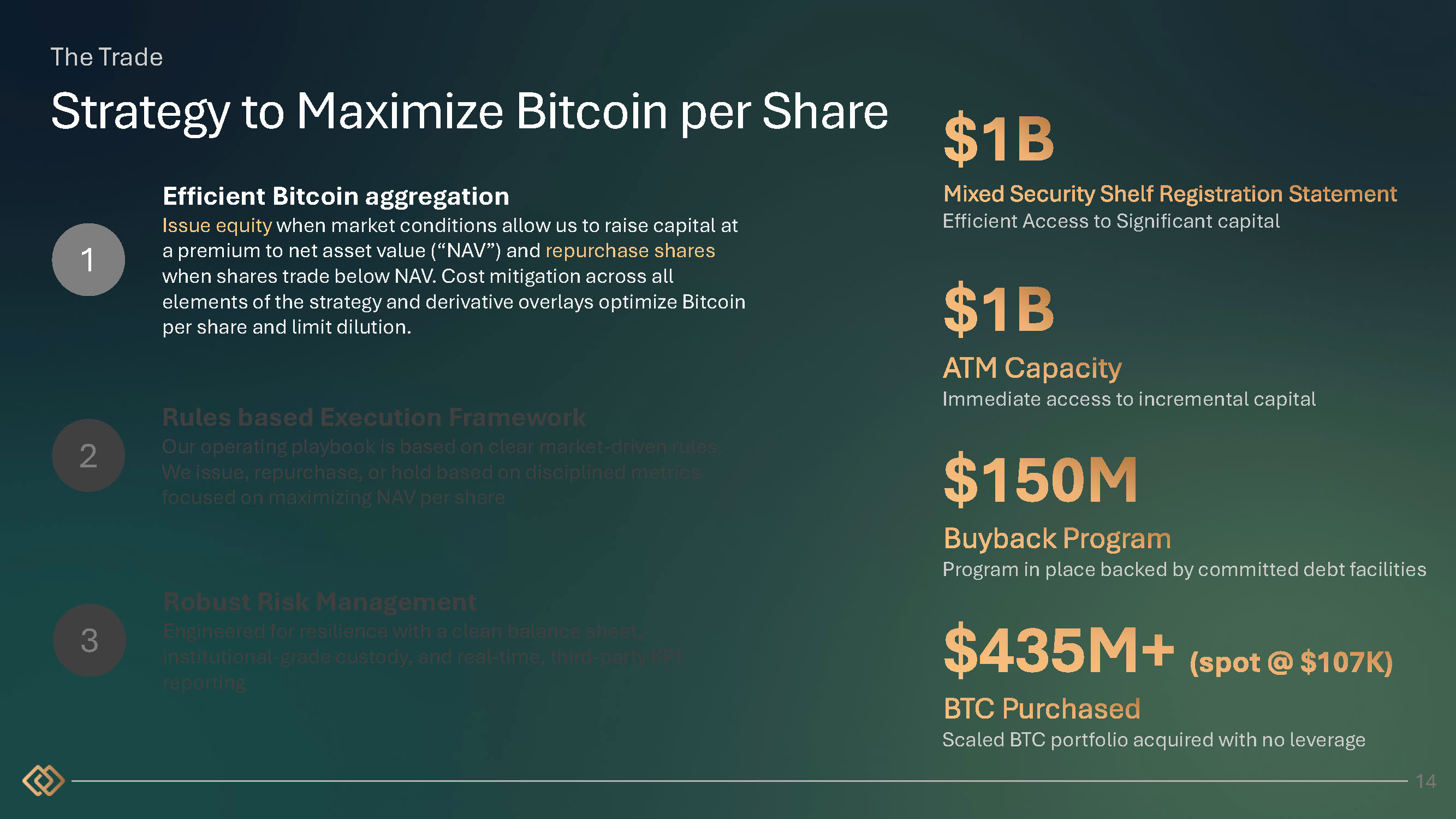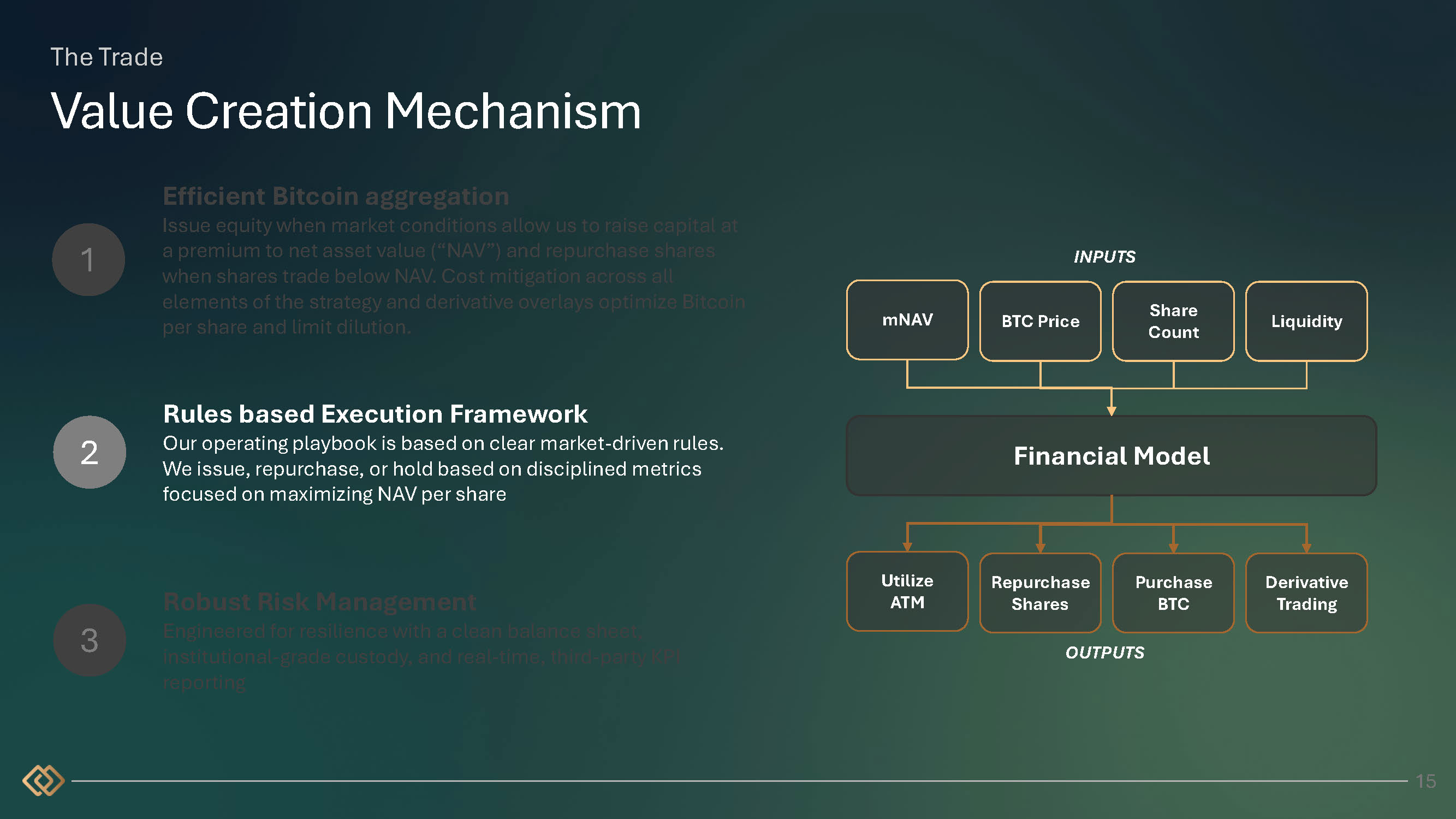 OUTPUTS The Trade Value Creation Mechanism 2 3 Robust Risk Management Engineered for resilience with a clean balance sheet, institutional - grade custody, and real - time, third - party KPI reporting Rules based Execution Framework Our operating playbook is based on clear market - driven rules. We issue, repurchase, or hold based on disciplined metrics focused on maximizing NAV per share mNAV BTC Price Share Count Liquidity Financial Model Utilize ATM Repurchase Shares Purchase BTC Derivative Trading 1 15 Efficient Bitcoin aggregation Issue equity when market conditions allow us to raise capital at a premium to net asset value (“NAV”) and repurchase shares when shares trade below NAV. Cost mitigation across all elements of the strategy and derivative overlays optimize Bitcoin per share and limit dilution. INPUTS