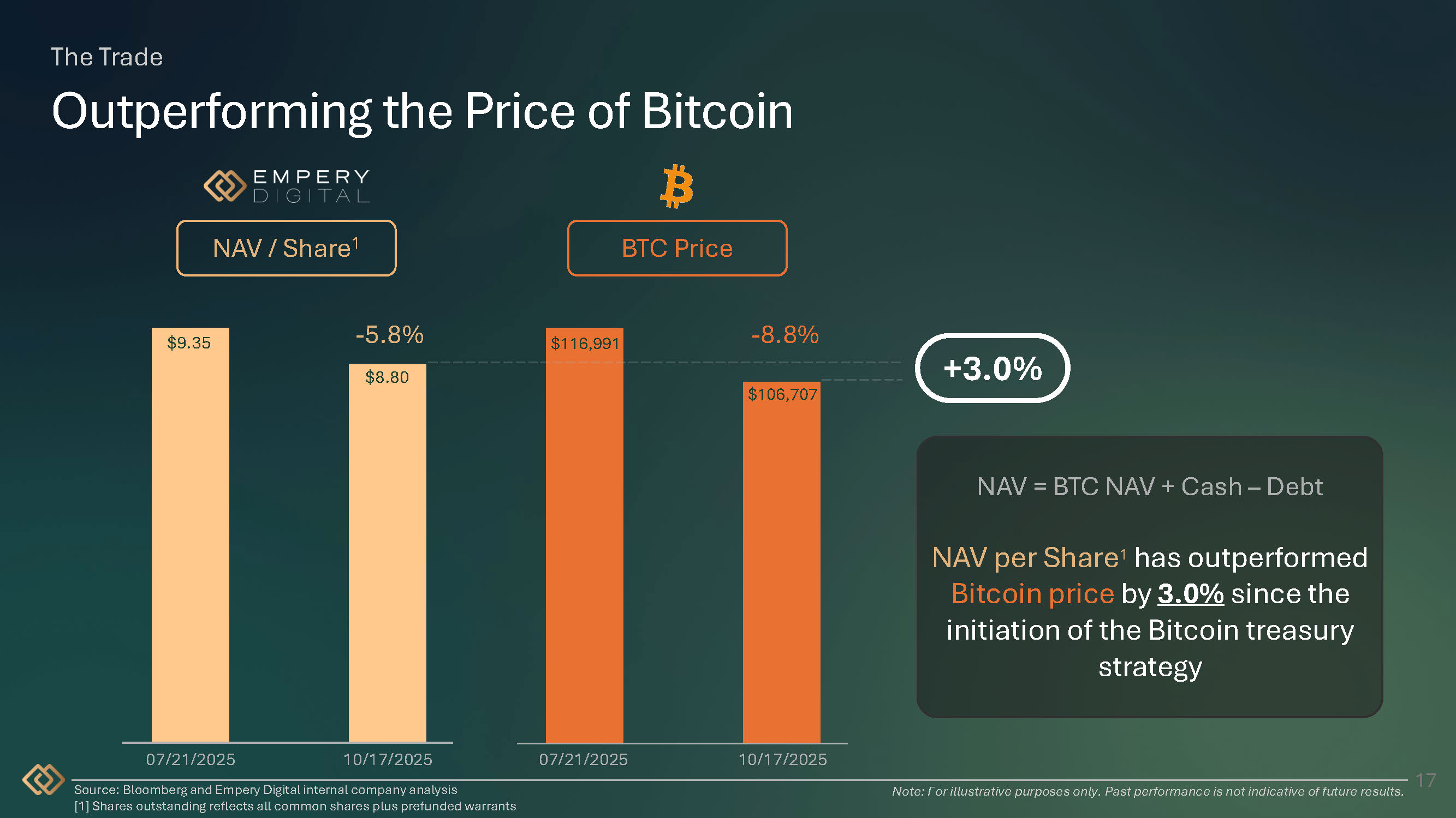 The Trade Transparent and Clean Structure 2 3 Robust Risk Management Engineered for resilience with a clean balance sheet, institutional - grade custody, and real - time, third - party KPI reporting Rules based Execution Framework Our operating playbook is based on clear market - driven rules. We issue, repurchase, or hold based on disciplined BTC - per - share metrics, not headlines 1 16 Efficient Bitcoin aggregation Issue equity when market conditions allow us to raise capital at a premium to net asset value (“NAV”) and repurchase shares when shares trade below NAV. Cost mitigation across all elements of the strategy and derivative overlays optimize Bitcoin per share and limit dilution.