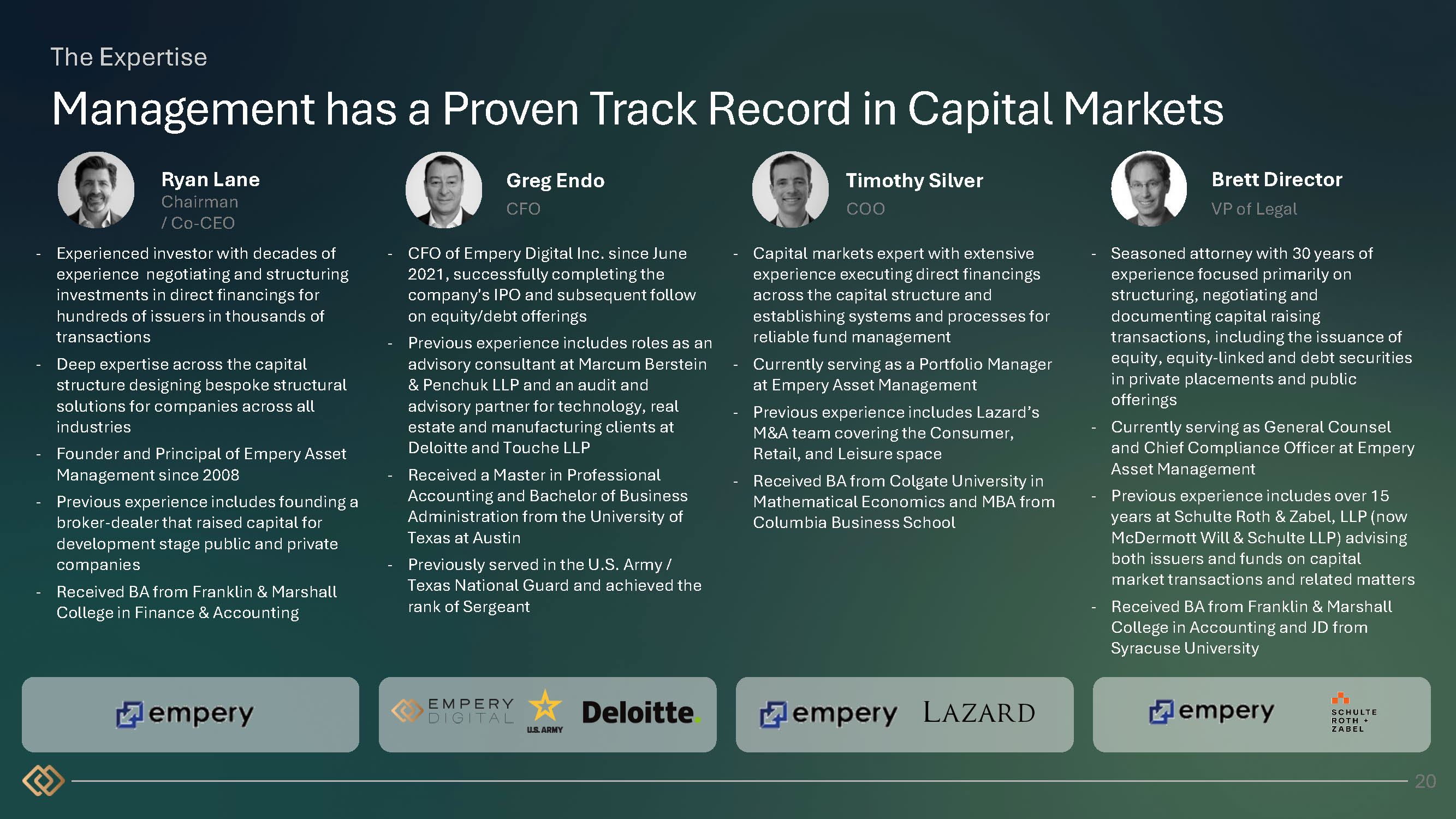 The Expertise Management has a Proven Track Record in Capital Markets Timothy Silver COO Brett Director VP of Legal - CFO of Empery Digital Inc. since June 2021, successfully completing the company's IPO and subsequent follow on equity/debt offerings - Previous experience includes roles as an advisory consultant at Marcum Berstein & Penchuk LLP and an audit and advisory partner for technology, real estate and manufacturing clients at Deloitte and Touche LLP - Received a Master in Professional Accounting and Bachelor of Business Administration from the University of Texas at Austin - Previously served in the U.S. Army / Texas National Guard and achieved the rank of Sergeant - Capital markets expert with extensive experience executing direct financings across the capital structure and establishing systems and processes for reliable fund management - Currently serving as a Portfolio Manager at Empery Asset Management - Previous experience includes Lazard’s M&A team covering the Consumer, Retail, and Leisure space - Received BA from Colgate University in Mathematical Economics and MBA from Columbia Business School Ryan Lane Chairman / Co - CEO - Experienced investor with decades of experience negotiating and structuring investments in direct financings for hundreds of issuers in thousands of transactions - Deep expertise across the capital structure designing bespoke structural solutions for companies across all industries - Founder and Principal of Empery Asset Management since 2008 - Previous experience includes founding a broker - dealer that raised capital for development stage public and private companies - Received BA from Franklin & Marshall College in Finance & Accounting - Seasoned attorney with 30 years of experience focused primarily on structuring, negotiating and documenting capital raising transactions, including the issuance of equity, equity - linked and debt securities in private placements and public offerings - Currently serving as General Counsel and Chief Compliance Officer at Empery Asset Management - Previous experience includes over 15 years at Schulte Roth & Zabel, LLP (now McDermott Will & Schulte LLP) advising both issuers and funds on capital market transactions and related matters - Received BA from Franklin & Marshall College in Accounting and JD from Syracuse University Greg Endo CFO 20