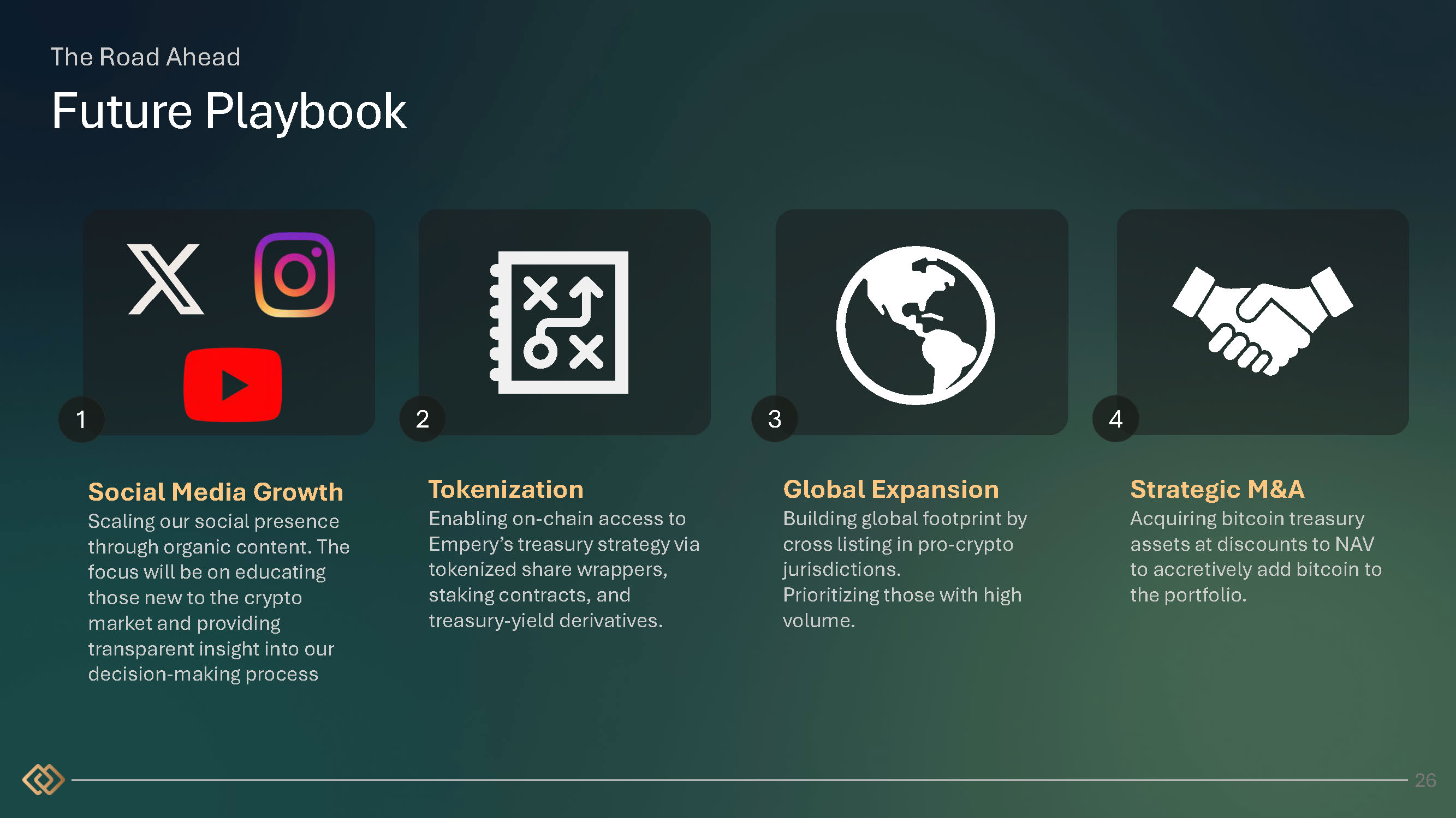 The Road Ahead Future Playbook Global Expansion Building global footprint by cross listing in pro - crypto jurisdictions. Prioritizing those with high volume. 3 Tokenization Enabling on - chain access to Empery’s treasury strategy via tokenized share wrappers, staking contracts, and treasury - yield derivatives. 2 Social Media Growth Scaling our social presence through organic content. The focus will be on educating those new to the crypto market and providing transparent insight into our decision - making process 1 Strategic M&A Acquiring bitcoin treasury assets at discounts to NAV to accretively add bitcoin to the portfolio. 4 26