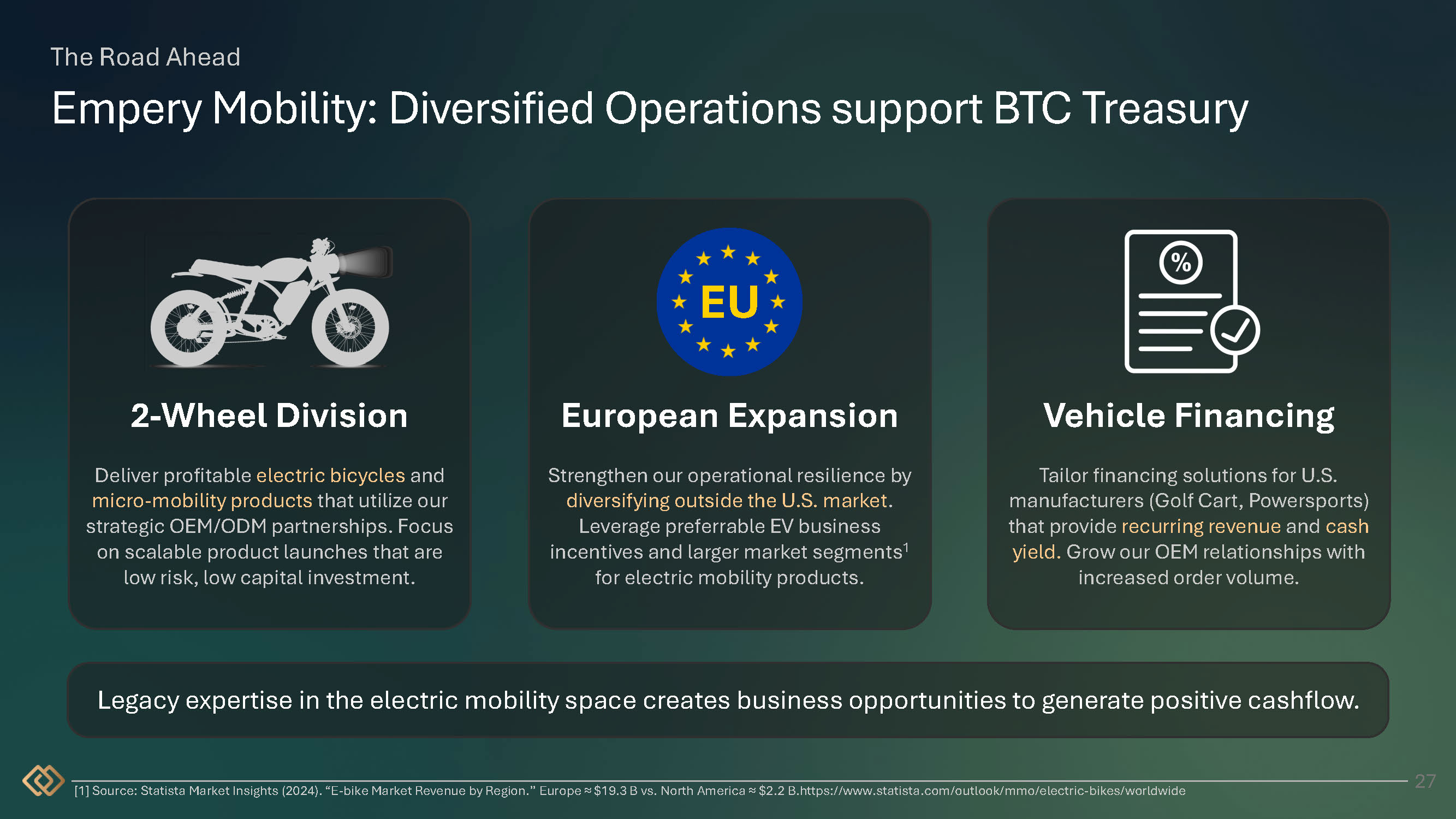 The Road Ahead Empery Mobility: Diversified Operations support BTC Treasury 27 European Expansion Strengthen our operational resilience by diversifying outside the U.S. market . Leverage preferrable EV business incentives and larger market segments 1 for electric mobility products. Vehicle Financing Tailor financing solutions for U.S. manufacturers (Golf Cart, Powersports) that provide recurring revenue and cash yield. Grow our OEM relationships with increased order volume. 2 - Wheel Division Deliver profitable electric bicycles and micro - mobility products that utilize our strategic OEM/ODM partnerships. Focus on scalable product launches that are low risk, low capital investment. EU Legacy expertise in the electric mobility space creates business opportunities to generate positive cashflow. [1] Source: Statista Market Insights (2024). “E - bike Market Revenue by Region.” Europe ≈ $19.3 B vs. North America ≈ $2.2 B.https:// www.statista.com/outlook/mmo/electric - bikes/worldwide