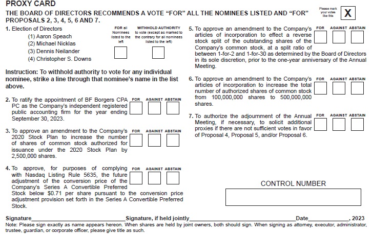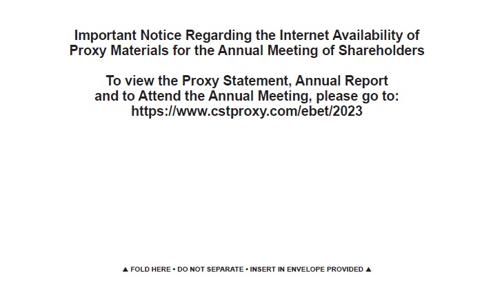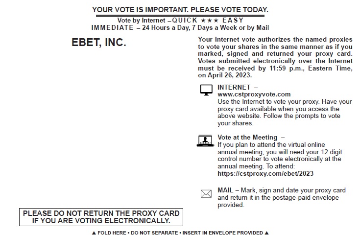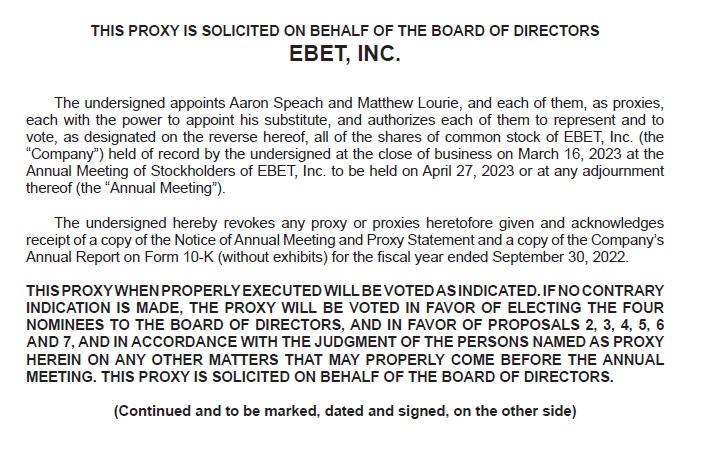 EBET, Inc. (the “Company”) is filing the attached proxy card as an amendment to the Definitive Proxy Statement on Schedule 14A that was filed by the Company with the U.S. Securities and Exchange Commission on March 27, 2023 (the “Proxy Statement”). After filing the Proxy Statement, the Company discovered that the form of proxy card was inadvertently omitted from the Proxy Statement. The proxy card has been made available to the Company’s stockholders in the form attached hereto.