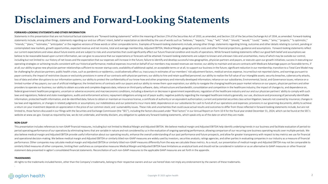 2 Disclaimers and Forward-Looking Statements FORWARD-LOOKING STATEMENTS AND OTHER INFORMATION Statements in this presentation that are not historical factual statements are “forward-looking statements” within the meaning of Section 27A of the Securities Act of 1933, as amended, and Section 21E of the Securities Exchange Act of 1934, as amended. Forward-looking statements include, among other things, statements regarding our and our officers’ intent, belief or expectation as identified by the use of words such as “believes,” “expects,” “may,” “will,” “shall,” “should,” “would,” “could,” “seeks,” “aims,” “projects,” “is optimistic,” “intends,” “plans,” “estimates,” “anticipates” or the negative versions of these words or other comparable terms. Examples of forward-looking statements include, among other things: statements regarding timing, outcomes and other details relating to current, pending or contemplated new markets, growth opportunities, expected revenue and net income, total and average membership, Adjusted EBITDA, Medical Margin, geography entry costs and other financial projections, guidance and assumptions. Forward-looking statements reflect our current expectations and views about future events and are subject to risks and uncertainties that could significantly affect our future financial condition and results of operations. While forward-looking statements reflect our good faith belief and assumptions we believe to be reasonable based upon current information, we can give no assurance that our expectations or forecasts will be attained. Forward-looking statements are subject to known and unknown risks and uncertainties, many of which may be outside our control, including but not limited to: our history of net losses and the expectation that our expenses will increase in the future; failure to identify and develop successful new geographies, physician partners and payors, or execute upon our growth initiatives; success in executing our operating strategies or achieving results consistent with our historical performance; medical expenses incurred on behalf of our members may exceed revenues we receive; our ability to maintain and secure contracts with Medicare Advantage payors on favorable terms, if at all; our ability to grow new physician partner relationships sufficient to recover startup costs; availability of additional capital, on acceptable terms or at all, to support our business in the future; significant reduction in our membership; transition to a Total Care Model may be challenging for physician partners; public health crises, such as pandemics or epidemics, could adversely affect us; inaccuracy in estimates of our members’ risk adjustment factors, medical services expense, incurred but not reported claims, and earnings pursuant to payor contracts; the impact of restrictive clauses or exclusivity provisions in some of our contracts with physician partners; our ability to hire and retain qualified personnel; our ability to realize the full value of our intangible assets; security breaches, cybersecurity attacks, loss of data and other disruptions to our information systems; our ability to protect the confidentiality of our know-how and other proprietary and internally developed information; reliance on our subsidiaries; Environmental, Social, and Governance issues; reliance on a limited number of key payors; our use of artificial intelligence; the limited terms of contracts with our payors and our ability to renew them upon expiration; our ability to navigate the changing healthcare payor market reliance on our payors, physician partners and other providers to operate our business; our ability to obtain accurate and complete diagnosis data; reliance on third-party software, data, infrastructure and bandwidth; consolidation and competition in the healthcare industry; the impact of changes to, and dependence on, federal government healthcare programs; uncertain or adverse economic and macroeconomic conditions, including a downturn or decrease in government expenditures; regulation of the healthcare industry and our and our physician partners’ ability to comply with such laws and regulations; federal and state investigations, audits and enforcement actions; repayment obligations arising out of payor audits; negative publicity regarding the managed healthcare industry generally; our use, disclosure and processing of personally identifiable information, protected health information, and de-identified data; failure to obtain or maintain an insurance license, a certificate of authority or an equivalent authorization; current and potential securities class action litigation; lawsuits not covered by insurance; changes in tax laws and regulations, or changes in related judgments or assumptions; our indebtedness and our potential to incur more debt; dependence on our subsidiaries for cash to fund all of our operations and expenses; provisions in our governing documents; ability to achieve a return on your investment depends on appreciation in the price of our common stock; and sustainability issues. These risks and uncertainties that could cause actual results and outcomes to differ from those reflected in forward-looking statements include, but are not limited to, those factors discussed in our filings with the Securities and Exchange Commission (the “SEC”), including the factors discussed under “Risk Factors” in our Annual Report on Form 10-K for the fiscal year ended December 31, 2024, which can be found at the SEC’s website at www.sec.gov. Except as required by law, we do not undertake, and hereby disclaim, any obligation to update any forward-looking statements, which speak only as of the date on which they are made. NON-GAAP This presentation includes references to non-GAAP financial measures, including but not limited to Medical Margin and Adjusted EBITDA. We believe medical margin and Adj