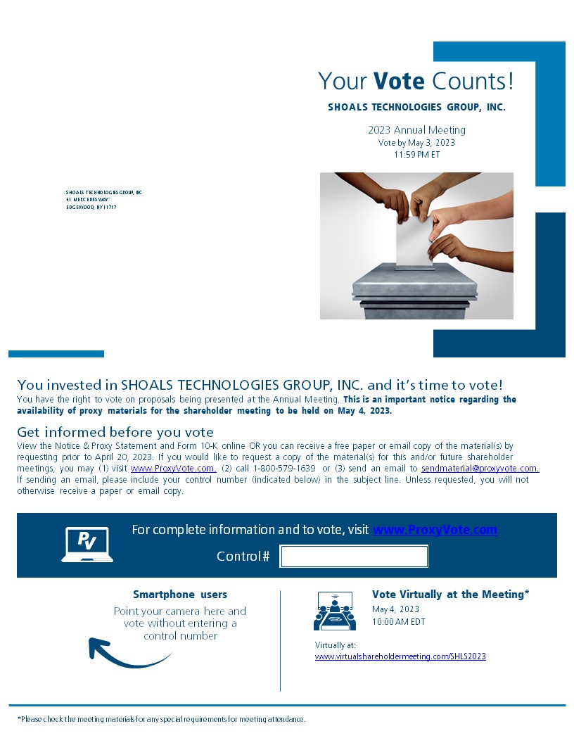 11717  SHOALS TECHNOLOGIES GROUP, INC.  2023 Annual Meeting  Vote by May 3, 2023  11:59 PM ET  You invested in SHOALS TECHNOLOGIES GROUP, INC. and it’s time to vote!  You have the right to vote on proposals being presented at the Annual