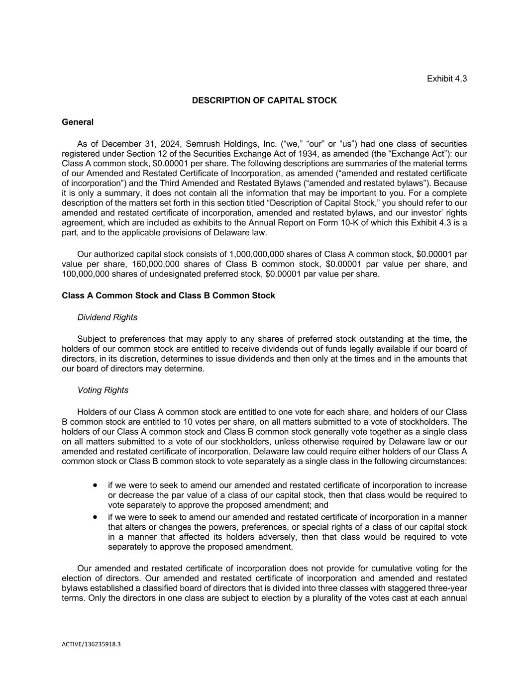ACTIVE/136235918.3 Exhibit 4.3 DESCRIPTION OF CAPITAL STOCK General As of December 31, 2024, Semrush Holdings, Inc. (“we,” “our” or “us”) had one class of securities registered under Section 12 of the Securities Exchange Act of 1934, as amended (the “Exchange Act”): our Class A common stock, $0.00001 per share. The following descriptions are summaries of the material terms of our Amended and Restated Certificate of Incorporation, as amended (“amended and restated certificate of incorporation”) and the Third Amended and Restated Bylaws (“amended and restated bylaws”). Because it is only a summary, it does not contain all the information that may be important to you. For a complete description of the matters set forth in this section titled “Description of Capital Stock,” you should refer to our amended and restated certificate of incorporation, amended and restated bylaws, and our investor’ rights agreement, which are included as exhibits to the Annual Report on Form 10-K of which this Exhibit 4.3 is a part, and to the applicable provisions of Delaware law. Our authorized capital stock consists of 1,000,000,000 shares of Class A common stock, $0.00001 par value per share, 160,000,000 shares of Class B common stock, $0.00001 par value per share, and 100,000,000 shares of undesignated preferred stock, $0.00001 par value per share. Class A Common Stock and Class B Common Stock Dividend Rights Subject to preferences that may apply to any shares of preferred stock outstanding at the time, the holders of our common stock are entitled to receive dividends out of funds legally available if our board of directors, in its discretion, determines to issue dividends and then only at the times and in the amounts that our board of directors may determine. Voting Rights Holders of our Class A common stock are entitled to one vote for each share, and holders of our Class B common stock are entitled to 10 votes per share, on all matters submitted to a vote of stockholders. The holders of our Class A common stock and Class B common stock generally vote together as a single class on all matters submitted to a vote of our stockholders, unless otherwise required by Delaware law or our amended and restated certificate of incorporation. Delaware law could require either holders of our Class A common stock or Class B common stock to vote separately as a single class in the following circumstances: • if we were to seek to amend our amended and restated certificate of incorporation to increase or decrease the par value of a class of our capital stock, then that class would be required to vote separately to approve the proposed amendment; and • if we were to seek to amend our amended and restated certificate of incorporation in a manner that alters or changes the powers, preferences, or special rights of a class of our capital stock in a manner that affected its holders adversely, then that class would be required to vote separately to approve the proposed amendment. Our amended and restated certificate of incorporation does not provide for cumulative voting for the election of directors. Our amended and restated certificate of incorporation and amended and restated bylaws established a classified board of directors that is divided into three classes with staggered three-year terms. Only the directors in one class are subject to election by a plurality of the votes cast at each annual