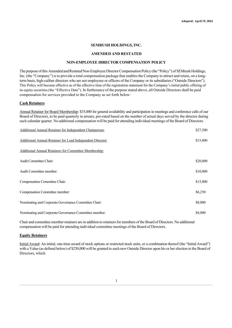 Adopted: April 19, 2024 SEMRUSH HOLDINGS, INC. AMENDED AND RESTATED NON-EMPLOYEE DIRECTOR COMPENSATION POLICY The purpose of this Amended and Restated Non-Employee Director Compensation Policy (the “Policy”) of SEMrush Holdings, Inc. (the “Company”) is to provide a total compensation package that enables the Company to attract and retain, on a long- term basis, high-caliber directors who are not employees or officers of the Company or its subsidiaries (“Outside Directors”). This Policy will become effective as of the effective time of the registration statement for the Company’s initial public offering of its equity securities (the “Effective Date”). In furtherance of the purpose stated above, all Outside Directors shall be paid compensation for services provided to the Company as set forth below: Cash Retainers Annual Retainer for Board Membership: $35,000 for general availability and participation in meetings and conference calls of our Board of Directors, to be paid quarterly in arrears, pro-rated based on the number of actual days served by the director during such calendar quarter. No additional compensation will be paid for attending individual meetings of the Board of Directors. Additional Annual Retainer for Independent Chairperson: $27,500 Additional Annual Retainer for Lead Independent Director: $15,000 Additional Annual Retainers for Committee Membership: Audit Committee Chair: $20,000 Audit Committee member: $10,000 Compensation Committee Chair: $15,000 Compensation Committee member: $6,250 Nominating and Corporate Governance Committee Chair: $8,000 Nominating and Corporate Governance Committee member: $4,000 Chair and committee member retainers are in addition to retainers for members of the Board of Directors. No additional compensation will be paid for attending individual committee meetings of the Board of Directors. Equity Retainers Initial Award: An initial, one-time award of stock options or restricted stock units, or a combination thereof (the “Initial Award”) with a Value (as defined below) of $250,000 will be granted to each new Outside Director upon his or her election to the Board of Directors, which 1