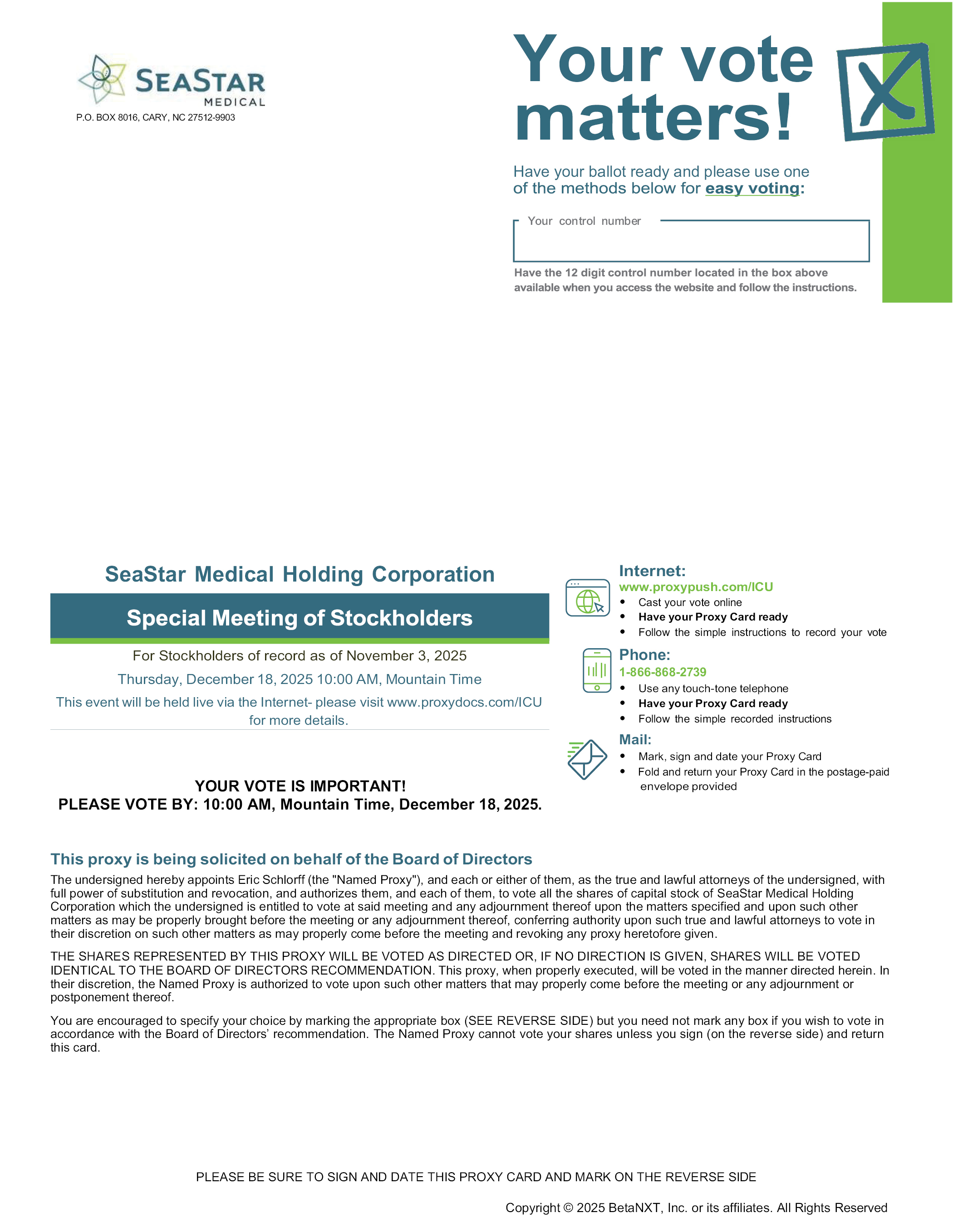 Your vote matters! P.O. BOX 8016, CARY, NC 27512-9903 Have your ballot ready and please use one of the methods below for easy voting: Your control number Have the 12 digit control number located in the box above available when you access the website and follow the instructions. SeaStar Medical Holding Corporation Special Meeting of Stockholders For Stockholders of record as of November 3, 2025 Thursday, December 18, 2025 10:00 AM, Mountain Time This event will be held live via the Internet- please visit www.proxydocs.com/ICU for more details. YOUR VOTE IS IMPORTANT! PLEASE VOTE BY: 10:00 AM, Mountain Time, December 18, 2025. This proxy is being solicited on behalf of the Board of Directors Internet: www.proxypush.com/ICU • Cast your vote online • Have your Proxy Card ready • Follow the simple instructions to record your vote Phone: 1-866-868-2739 • Use any touch-tone telephone • Have your Proxy Card ready • Follow the simple recorded instructions Mail: • Mark, sign and date your Proxy Card • Fold and return your Proxy Card in the postage-paid envelope provided The undersigned hereby appoints Eric Schlorff (the “Named Proxy”), and each or either of them, as the true and lawful attorneys of the undersigned, with full power of substitution and revocation, and authorizes them, and each of them, to vote all the shares of capital stock of SeaStar Medical Holding Corporation which the undersigned is entitled to vote at said meeting and any adjournment thereof upon the matters specified and upon such other matters as may be properly brought before the meeting or any adjournment thereof, conferring authority upon such true and lawful attorneys to vote in their discretion on such other matters as may properly come before the meeting and revoking any proxy heretofore given. THE SHARES REPRESENTED BY THIS PROXY WILL BE VOTED AS DIRECTED OR, IF NO DIRECTION IS GIVEN, SHARES WILL BE VOTED IDENTICAL TO THE BOARD OF DIRECTORS RECOMMENDATION. This proxy, when properly executed, will be voted in the manner directed herein. In their discretion, the Named Proxy is authorized to vote upon such other matters that may properly come before the meeting or any adjournment or postponement thereof. You are encouraged to specify your choice by marking the appropriate box (SEE REVERSE SIDE) but you need not mark any box if you wish to vote in accordance with the Board of Directors’ recommendation. The Named Proxy cannot vote your shares unless you sign (on the reverse side) and return this card. PLEASE BE SURE TO SIGN AND DATE THIS PROXY CARD AND MARK ON THE REVERSE SIDE Copyright © 2025 BetaNXT, Inc. or its affiliates. All Rights Reserved