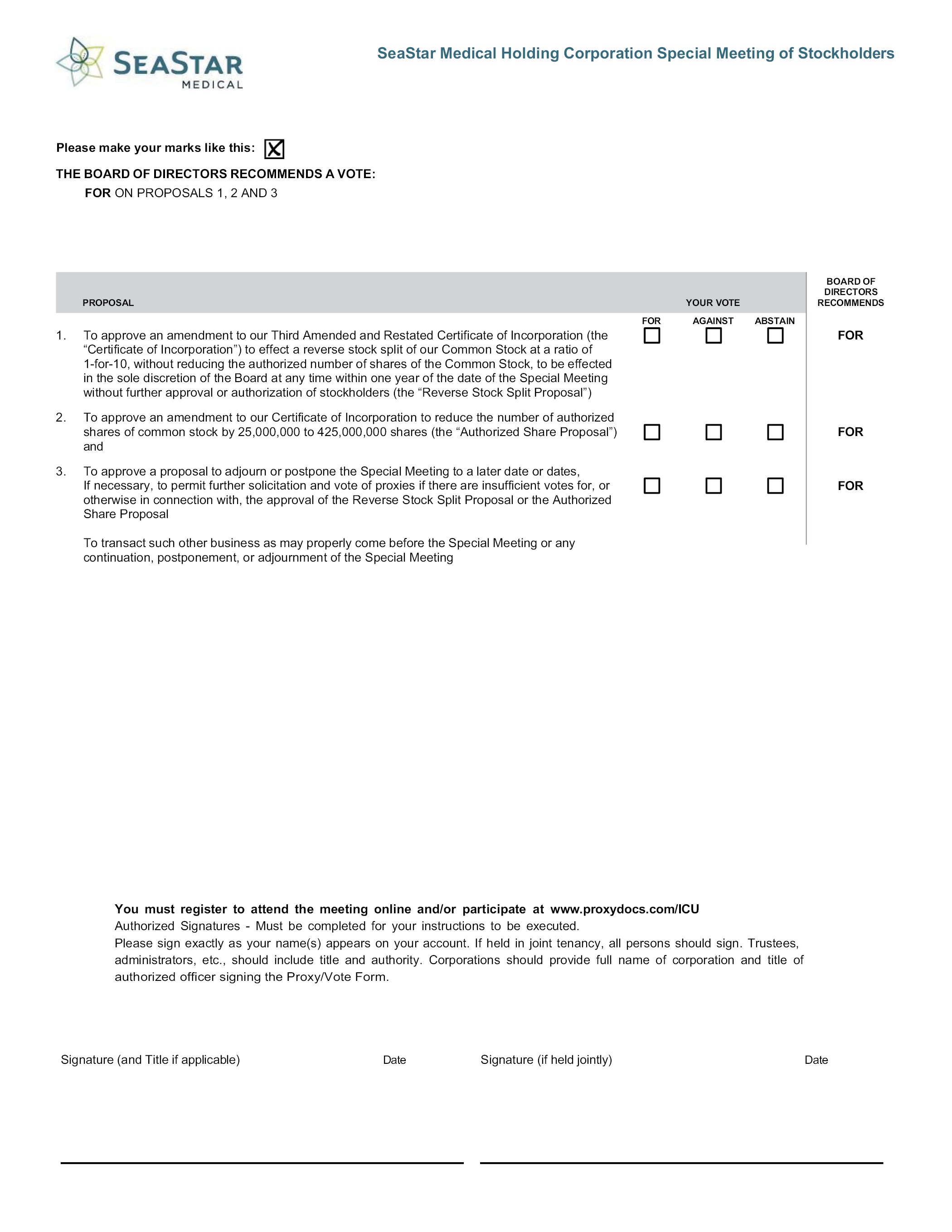 SeaStar Medical Holding Corporation Special Meeting of Stockholders Please make your marks like this: THE BOARD OF DIRECTORS RECOMMENDS A VOTE: FOR ON PROPOSALS 1, 2 AND 3 PROPOSAL YOUR VOTE 1. To approve an amendment to our Third Amended and Restated Certificate of Incorporation (the “Certificate of Incorporation”) to effect a reverse stock split of our Common Stock at a ratio of 1-for-10, without reducing the authorized number of shares of the Common Stock, to be effected in the sole discretion of the Board at any time within one year of the date of the Special Meeting without further approval or authorization of stockholders (the “Reverse Stock Split Proposal”) 2. To approve an amendment to our Certificate of Incorporation to reduce the number of authorized shares of common stock by 25,000,000 to 425,000,000 shares (the “Authorized Share Proposal”) and 3. To approve a proposal to adjourn or postpone the Special Meeting to a later date or dates, If necessary, to permit further solicitation and vote of proxies if there are insufficient votes for, or otherwise in connection with, the approval of the Reverse Stock Split Proposal or the Authorized Share Proposal To transact such other business as may properly come before the Special Meeting or any continuation, postponement, or adjournment of the Special Meeting FOR AGAINST ABSTAIN BOARD OF DIRECTORS RECOMMENDS FOR You must register to attend the meeting online and/or participate at www.proxydocs.com/ICU Authorized Signatures - Must be completed for your instructions to be executed. Please sign exactly as your name(s) appears on your account. If held in joint tenancy, all persons should sign. Trustees, administrators, etc., should include title and authority. Corporations should provide full name of corporation and title of authorized officer signing the Proxy/Vote Form. Signature (and Title if applicable) Date Signature (if held jointly) Date