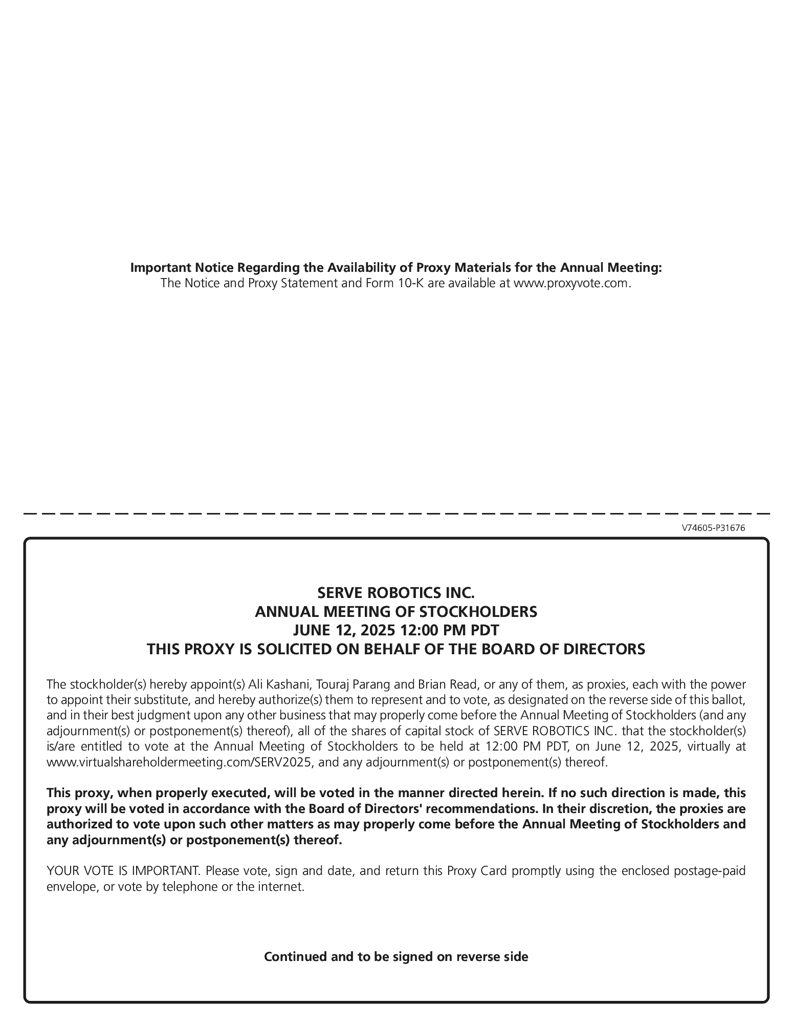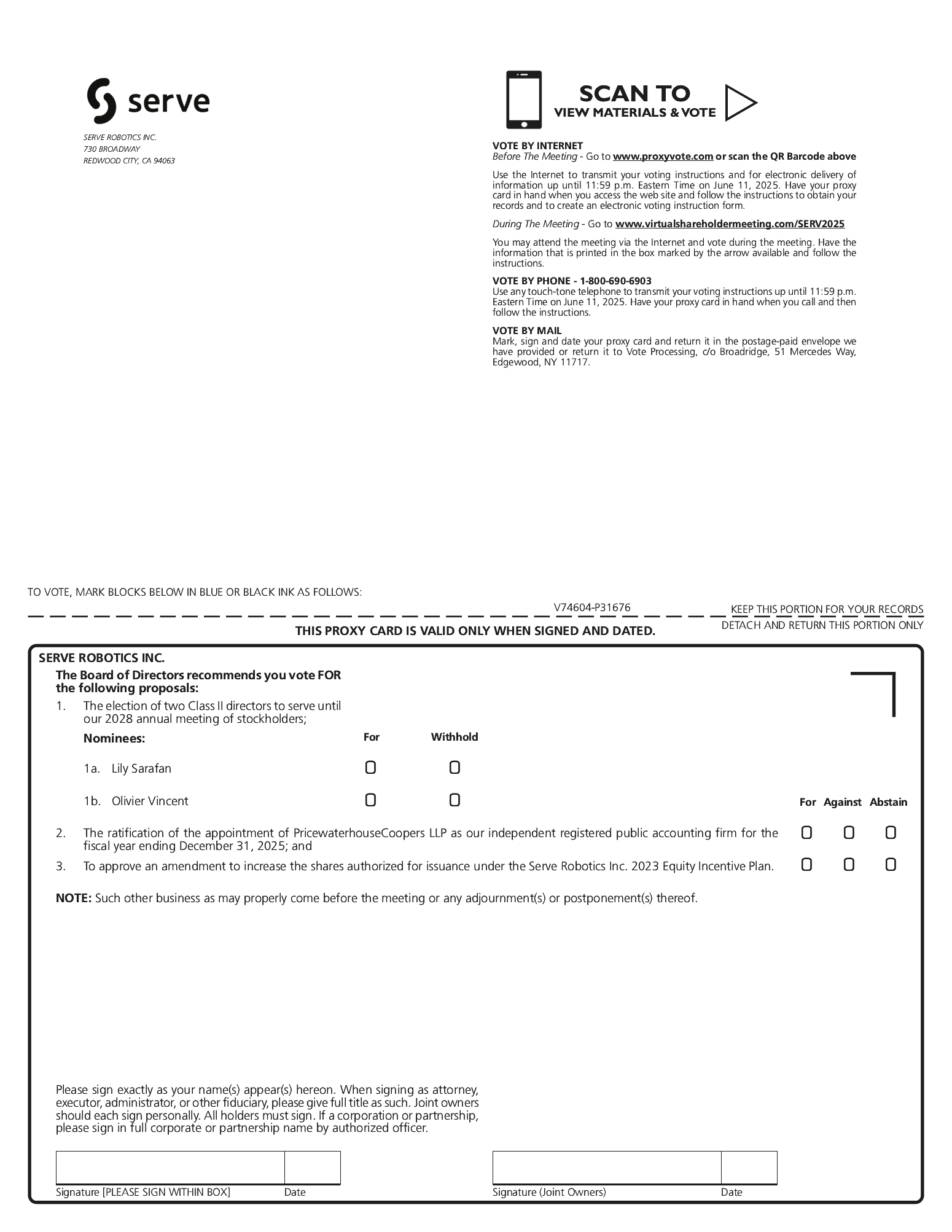 On September 18, 2023, Serve entered into a consulting agreement (the “Consulting Agreement”) with Mr. Goldberg, a nominee for election as a Class I director at the Annual Meeting. Pursuant to the Consulting Agreement, Mr. Goldberg was paid a one-time fee of $50,000 as well as an additional payment of $125,000 that was contingent upon the Company closing new financing during the term of the Consulting Agreement, for a total cash payment of $175,000. Additionally, in connection with the Consulting Agreement, the Company granted Mr. Goldberg a restricted stock unit award of 50,000 shares of the Company’s common stock, all of which vested on May 18, 2024. The Consulting Agreement terminated on March 18, 2024.