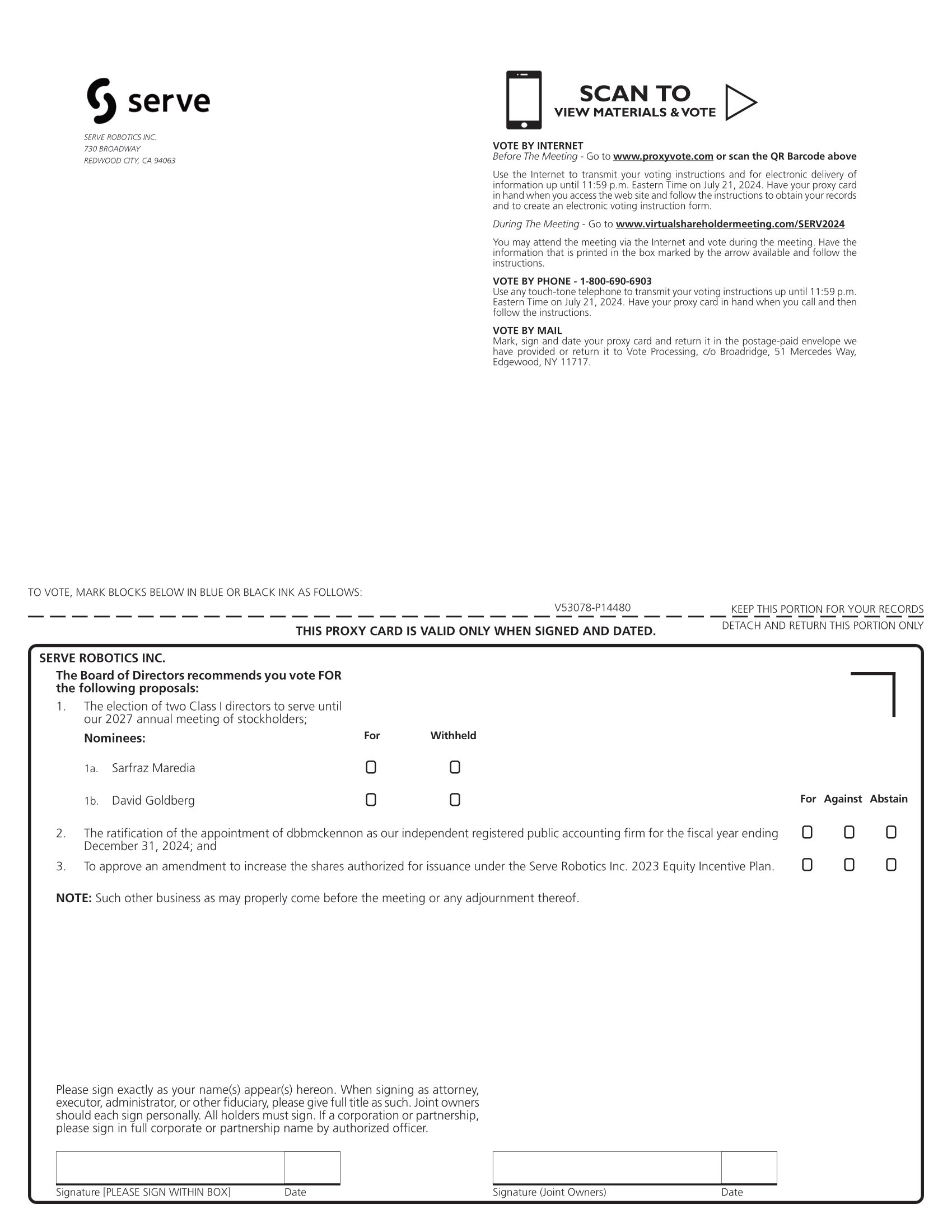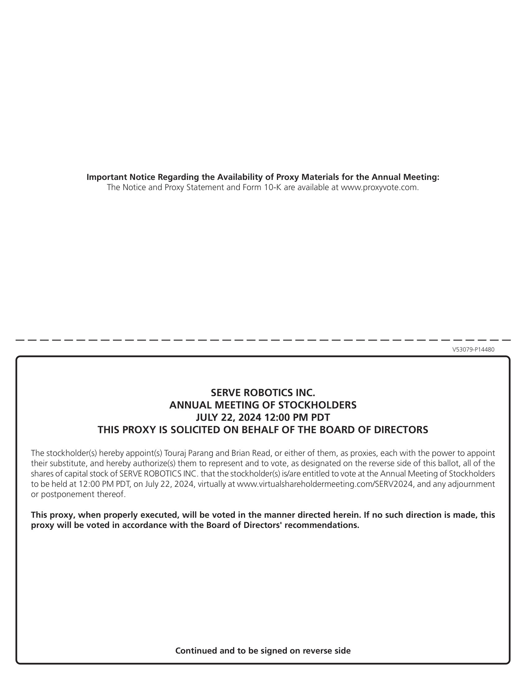 We cordially invite you to attend the 2024 annual meeting of stockholders (the “Annual Meeting”) of Serve Robotics Inc., a Delaware corporation, which will be held on July 22, 2024 at 12:00 p.m. Pacific Time. The Annual Meeting will be held as a virtual meeting, which will be conducted via live webcast. In order to attend the Annual Meeting, you must register in advance at www.virtualshareholdermeeting.com/SERV2024 prior to the deadline of 11:45 a.m. Pacific Time on July 22, 2024. After completing the registration, you will receive a confirmation email, which will include information about when you should expect to receive a unique link to gain access to the Annual Meeting. You will not be able to attend the meeting in person. The meeting will be held for the following purposes, as more fully described in the accompanying proxy statement (the “Proxy Statement”):
