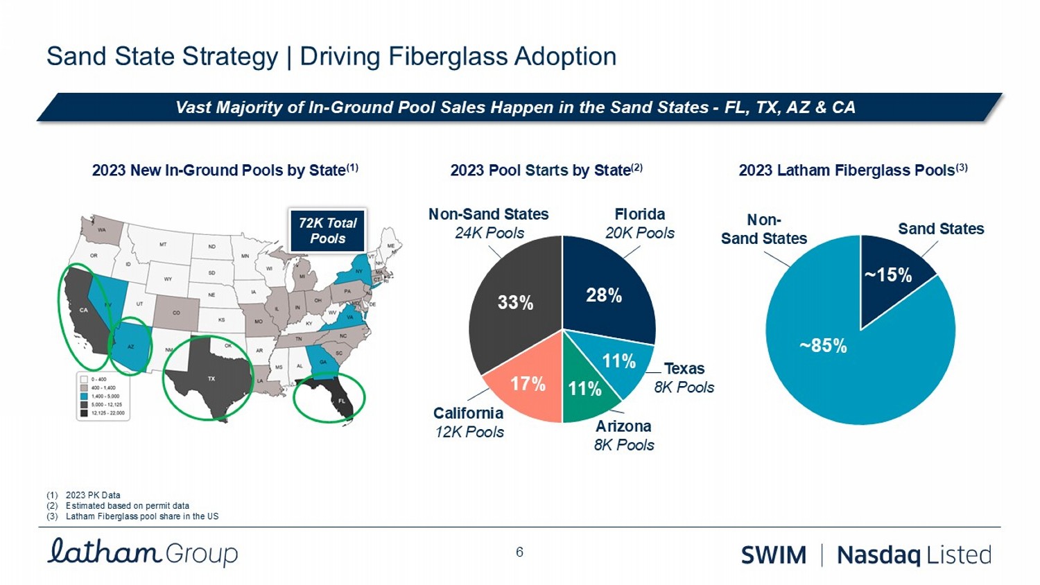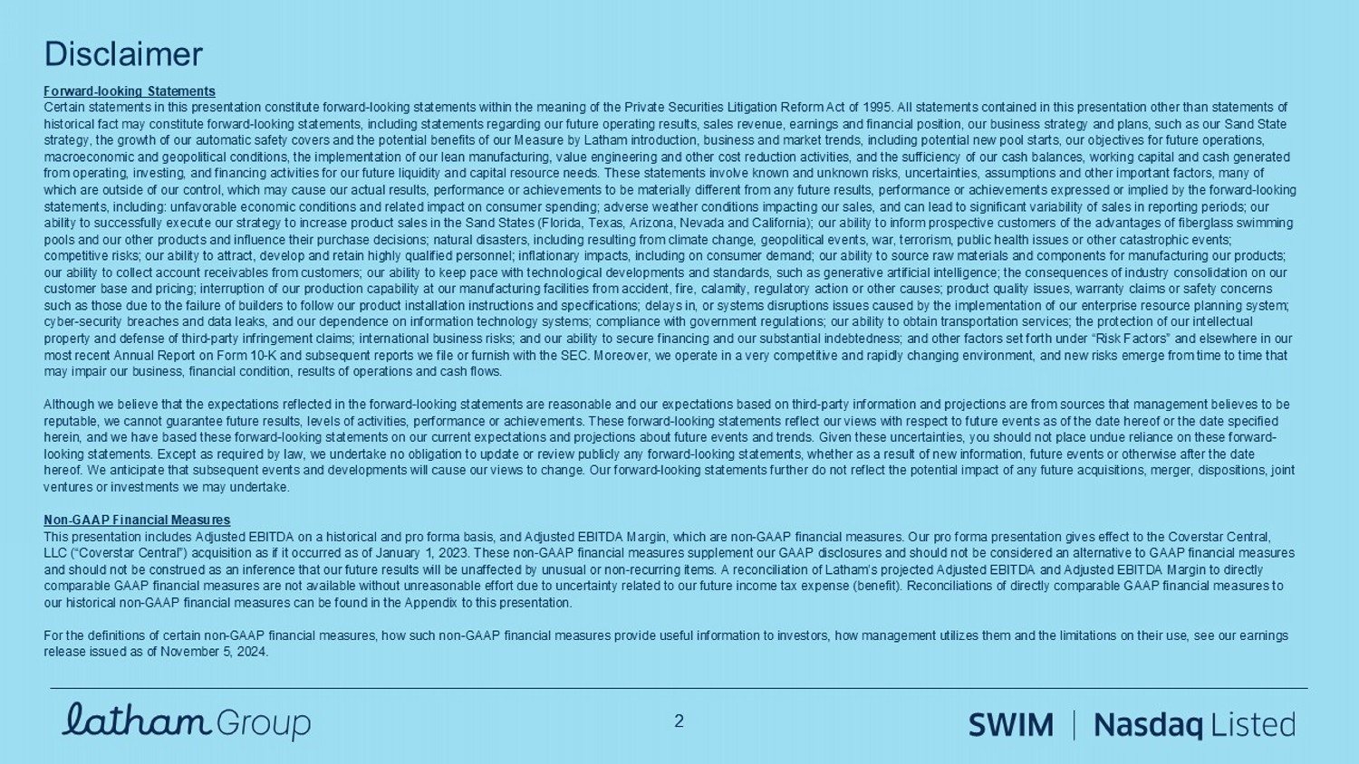 Forward - looking Statements Certain statements in this presentation constitute forward - looking statements within the meaning of the Private Securities Litig ation Reform Act of 1995. All statements contained in this presentation other than statements of historical fact may constitute forward - looking statements, including statements regarding our future operating results, sales re venue, earnings and financial position, our business strategy and plans, such as our Sand State strategy, the growth of our automatic safety covers and the potential benefits of our Measure by Latham introduction, busines s a nd market trends, including potential new pool starts, our objectives for future operations, macroeconomic and geopolitical conditions, the implementation of our lean manufacturing, value engineering and other cost red uct ion activities, and the sufficiency of our cash balances, working capital and cash generated from operating, investing, and financing activities for our future liquidity and capital resource needs. These statements inv olv e known and unknown risks, uncertainties, assumptions and other important factors, many of which are outside of our control, which may cause our actual results, performance or achievements to be materially different fro m any future results, performance or achievements expressed or implied by the forward - looking statements, including: unfavorable economic conditions and related impact on consumer spending; adverse weather conditions im pac ting our sales, and can lead to significant variability of sales in reporting periods; our ability to successfully execute our strategy to increase product sales in the Sand States (Florida, Texas, Arizona, Nevada an d C alifornia); our ability to inform prospective customers of the advantages of fiberglass swimming pools and our other products and influence their purchase decisions; natural disasters, including resulting from climate chan ge, geopolitical events, war, terrorism, public health issues or other catastrophic events; competitive risks; our ability to attract, develop and retain highly qualified personnel; inflationary impacts, including on con sumer demand; our ability to source raw materials and components for manufacturing our products; our ability to collect account receivables from customers; our ability to keep pace with technological developments and stand ard s, such as generative artificial intelligence; the consequences of industry consolidation on our customer base and pricing; interruption of our production capability at our manufacturing facilities from accident, fire, cal ami ty, regulatory action or other causes; product quality issues, warranty claims or safety concerns such as those due to the failure of builders to follow our product installation instructions and specifications; delays in, o r s ystems disruptions issues caused by the implementation of our enterprise resource planning system; cyber - security breaches and data leaks, and our dependence on information technology systems; compliance with government regulat ions; our ability to obtain transportation services; the protection of our intellectual property and defense of third - party infringement claims; international business risks; and our ability to secure financing and o ur substantial indebtedness; and other factors set forth under “Risk Factors” and elsewhere in our most recent Annual Report on Form 10 - K and subsequent reports we file or furnish with the SEC. Moreover, we operate in a very co mpetitive and rapidly changing environment, and new risks emerge from time to time that may impair our business, financial condition, results of operations and cash flows. Although we believe that the expectations reflected in the forward - looking statements are reasonable and our expectations based on third - party information and projections are from sources that management believes to be reputable, we cannot guarantee future results, levels of activities, performance or achievements. These forward - looking statemen ts reflect our views with respect to future events as of the date hereof or the date specified herein, and we have based these forward - looking statements on our current expectations and projections about future events and t rends. Given these uncertainties, you should not place undue reliance on these forward - looking statements. Except as required by law, we undertake no obligation to update or review publicly any forward - looking state ments, whether as a result of new information, future events or otherwise after the date hereof. We anticipate that subsequent events and developments will cause our views to change. Our forward - looking statements fur ther do not reflect the potential impact of any future acquisitions, merger, dispositions, joint ventures or investments we may undertake. Non - GAAP Financial Measures This presentation includes Adjusted EBITDA on a historical and pro forma basis, and Adjusted EBITDA Margin, which are non - GAAP f inancial measures. Our pro forma presentation gives effect to the Coverstar Central, LLC (“Coverstar Central”) acquisition as if it occurred as of January 1, 2023. These non - GAAP financial measures supplement our GAAP disclosures and should not be considered an alternative to GAAP financial measures and should not be construed as an inference that our future results will be unaffected by unusual or non - recurring items. A reco nciliation of Latham’s projected Adjusted EBITDA and Adjusted EBITDA Margin to directly comparable GAAP financial measures are not available without unreasonable effort due to uncertainty related to our future inc ome tax expense (benefit). Reconciliations of directly comparable GAAP financial measures to our historical non - GAAP financial measures can be found in the Appendix to this presentation. For the definitions of certain non - GAAP financial measures, how such non - GAAP financial measures provide useful information t