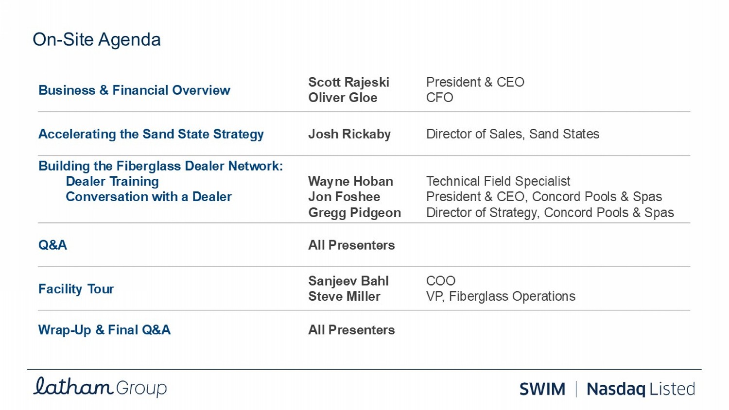 On - Site Agenda President & CEO CFO Scott Rajeski Oliver Gloe Business & Financial Overview Director of Sales, Sand States Josh Rickaby Accelerating the Sand State Strategy Technical Field Specialist President & CEO, Concord Pools & Spas Director of Strategy, Concord Pools & Spas Wayne Hoban Jon Foshee Gregg Pidgeon Building the Fiberglass Dealer Network: Dealer Training Conversation with a Dealer All Presenters Q&A COO VP, Fiberglass Operations Sanjeev Bahl Steve Miller Facility Tour All Presenters Wrap - Up & Final Q&A