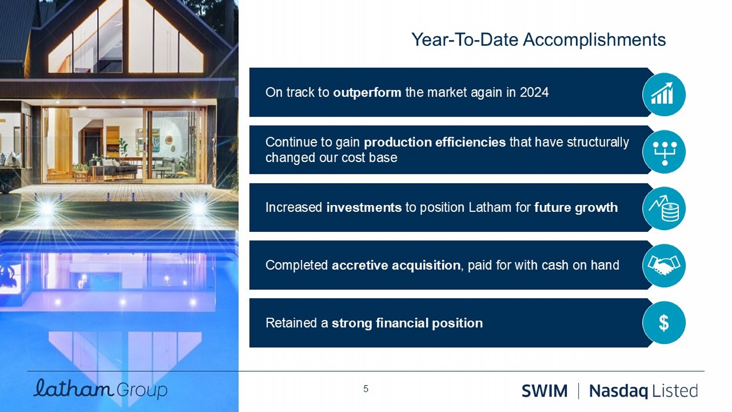 5 Year - To - Date Accomplishments Completed accretive acquisition , paid for with cash on hand On track to outperform the market again in 2024 Increased investments to position Latham for future growth Continue to gain production efficiencies that have structurally changed our cost base Retained a strong financial position $