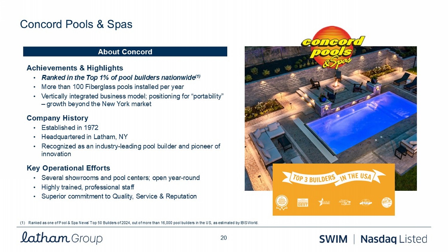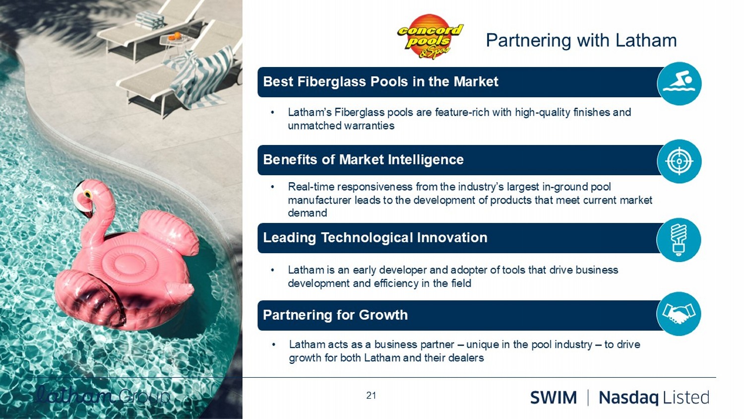 Achievements & Highlights • Ranked in the Top 1% of pool builders nationwide (1) • More than 100 Fiberglass pools installed per year • Vertically integrated business model; positioning for “portability” – growth beyond the New York market Company History • Established in 1972 • Headquartered in Latham, NY • Recognized as an industry - leading pool builder and pioneer of innovation Key Operational Efforts • Several showrooms and pool centers; open year - round • Highly trained, professional staff • Superior commitment to Quality, Service & Reputation Concord Pools & Spas 20 About Concord (1) Ranked as one of Pool & Spa News’ Top 50 Builders of 2024, out of more than 16,000 pool builders in the US, as estimated by I BIS World.