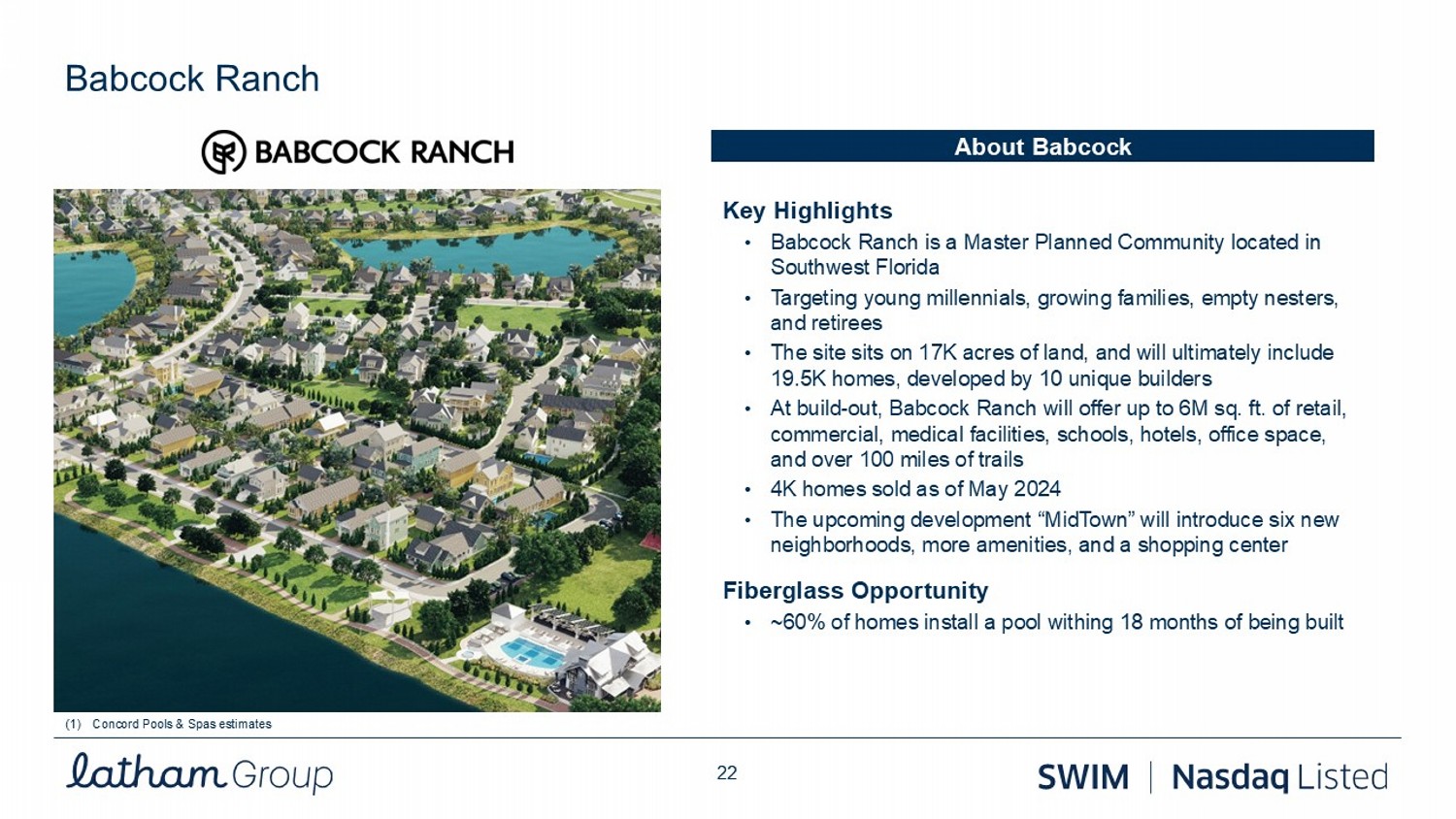 Babcock Ranch 22 About Babcock Key Highlights • Babcock Ranch is a Master Planned Community located in Southwest Florida • Targeting young millennials, growing families, empty nesters, and retirees • The site sits on 17K acres of land, and will ultimately include 19.5K homes, developed by 10 unique builders • At build - out, Babcock Ranch will offer up to 6M sq. ft. of retail, commercial, medical facilities, schools, hotels, office space, and over 100 miles of trails • 4K homes sold as of May 2024 • The upcoming development “ MidTown ” will introduce six new neighborhoods, more amenities, and a shopping center Fiberglass Opportunity • ~60% of homes install a pool withing 18 months of being built (1) Concord Pools & Spas estimates