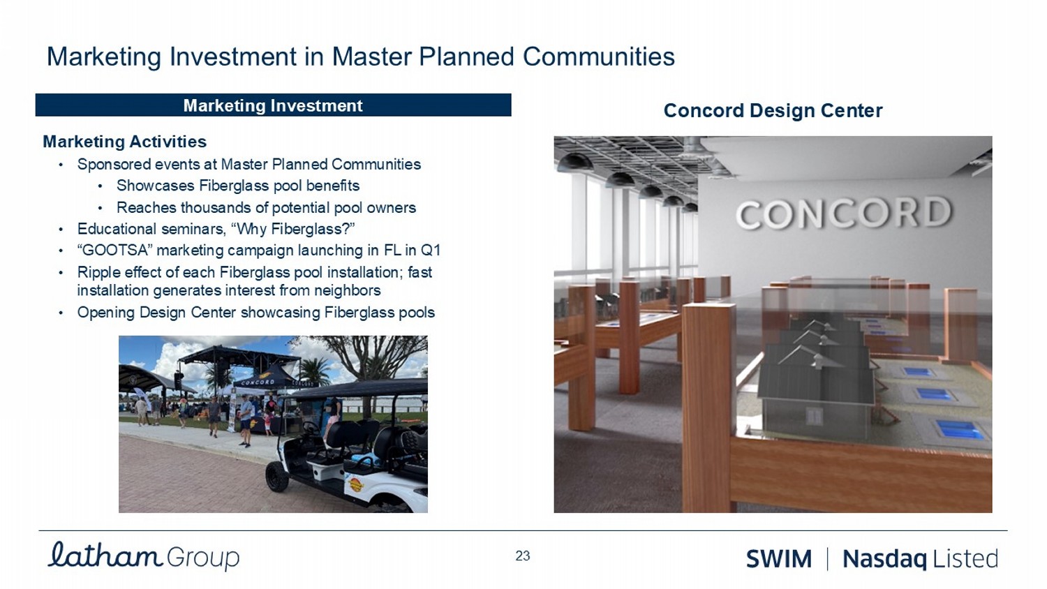 Marketing Investment in Master Planned Communities 23 Marketing Investment Marketing Activities • Sponsored events at Master Planned Communities • Showcases Fiberglass pool benefits • Reaches thousands of potential pool owners • Educational seminars, “Why Fiberglass?” • “GOOTSA” marketing campaign launching in FL in Q1 • Ripple effect of each Fiberglass pool installation; fast installation generates interest from neighbors • Opening Design Center showcasing Fiberglass pools Concord Design Center