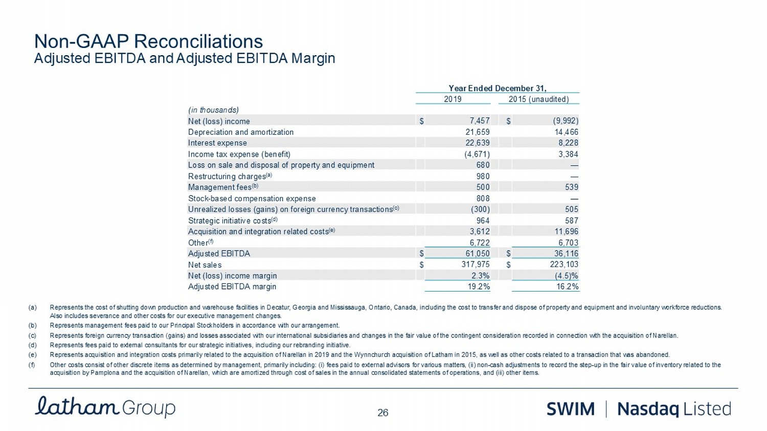 (a) Represents the cost of shutting down production and warehouse facilities in Decatur, Georgia and Mississauga, Ontario, Canada , i ncluding the cost to transfer and dispose of property and equipment and involuntary workforce reductions. Also includes severance and other costs for our executive management changes. (b) Represents management fees paid to our Principal Stockholders in accordance with our arrangement. (c) Represents foreign currency transaction (gains) and losses associated with our international subsidiaries and changes in the fai r value of the contingent consideration recorded in connection with the acquisition of Narellan . (d) Represents fees paid to external consultants for our strategic initiatives, including our rebranding initiative. (e) Represents acquisition and integration costs primarily related to the acquisition of Narellan in 2019 and the Wynnchurch acquisition of Latham in 2015, as well as other costs related to a transaction that was abandoned. (f) Other costs consist of other discrete items as determined by management, primarily including: ( i ) fees paid to external advisors for various matters, (ii) non - cash adjustments to record the step - up in the fair value of inven tory related to the acquisition by Pamplona and the acquisition of Narellan , which are amortized through cost of sales in the annual consolidated statements of operations, and (iii) other items. Non - GAAP Reconciliations Adjusted EBITDA and Adjusted EBITDA Margin 26 Year Ended December 31, 2015 (unaudited) 2019 (in thousands) (9,992) $ 7,457 $ Net (loss) income 14,466 21,659 Depreciation and amortization 8,228 22,639 Interest expense 3,384 (4,671) Income tax expense (benefit) — 680 Loss on sale and disposal of property and equipment — 980 Restructuring charges (a) 539 500 Management fees (b) — 808 Stock - based compensation expense 505 (300) Unrealized losses (gains) on foreign currency transactions  (c) 587 964 Strategic initiative costs (d) 11,696 3,612 Acquisition and integration related costs (e) 6,703 6,722 Other (f) 36,116 $ 61,050 $ Adjusted EBITDA 223,103 $ 317,975 $ Net sales (4.5)% 2.3% Net (loss) income margin 16.2% 19.2% Adjusted EBITDA margin