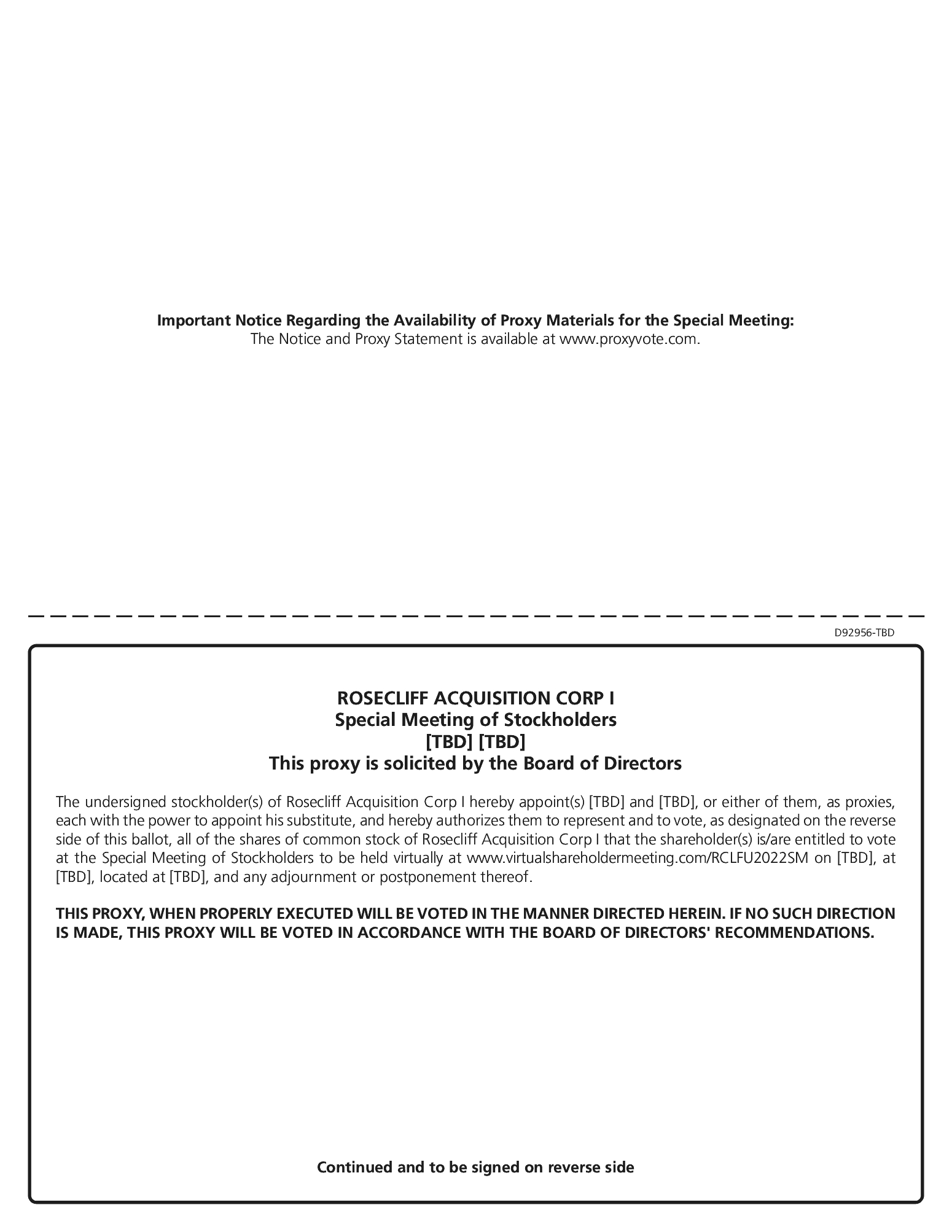 NOTICE IS HEREBY GIVEN that the special meeting of stockholders of Rosecliff Acquisition Corp I, a Delaware corporation (the “Company”, “we”, “us” or “our”), will be held at 10:00 a.m., Eastern time, on      , 2022 (the “Special Meeting”), or at such other time and on such other date to which the meeting may be adjourned or postponed. The Special Meeting will be held via the Internet and will be a completely virtual meeting of stockholders. You will be able to attend the Special Meeting online, vote, view the list of stockholders entitled to vote at the Special Meeting and submit your questions during the Special Meeting by visiting www.virtualshareholdermeeting.com/RCLFU2022SM. To enter the Special Meeting, you will need the 16-digit control number that is printed on your proxy card. We recommend logging in at least fifteen minutes before the meeting to ensure that you are logged in when the meeting starts. Online check-in will start shortly before the meeting on        , 2022. The accompanying proxy statement is dated      , 2022, and is first being mailed to stockholders of the Company on or about      , 2022.