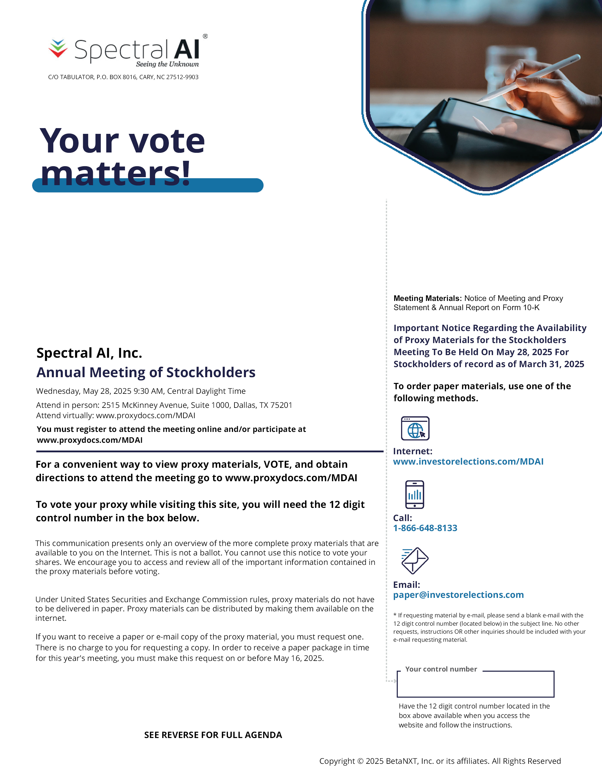 C/O TABULATOR, P.O. BOX 8016, CARY, NC 27512-9903 Your vote matters! Spectral AI, Inc. Annual Meeting of Stockholders Wednesday, May 28, 2025 9:30 AM, Central Daylight Time Attend in person: 2515 McKinney Avenue, Suite 1000, Dallas, TX 75201 Attend virtually: www.proxydocs.com/MDAI You must register to attend the meeting online and/or participate at www.proxydocs.com/MDAI For a convenient way to view proxy materials, VOTE, and obtain directions to attend the meeting go to www.proxydocs.com/MDAI To vote your proxy while visiting this site, you will need the 12 digit control number in the box below. This communication presents only an overview of the more complete proxy materials that are available to you on the Internet. This is not a ballot. You cannot use this notice to vote your shares. We encourage you to access and review all of the important information contained in the proxy materials before voting. Under United States Securities and Exchange Commission rules, proxy materials do not have to be delivered in paper. Proxy materials can be distributed by making them available on the internet. If you want to receive a paper or e-mail copy of the proxy material, you must request one. There is no charge to you for requesting a copy. In order to receive a paper package in time for this year’s meeting, you must make this request on or before May 16, 2025. SEE REVERSE FOR FULL AGENDA Meeting Materials: Notice of Meeting and Proxy Statement & Annual Report on Form 10-K Important Notice Regarding the Availability of Proxy Materials for the Stockholders Meeting To Be Held On May 28, 2025 For Stockholders of record as of March 31, 2025 To order paper materials, use one of the following methods. Internet: www.investorelections.com/MDAI Call: 1-866-648-8133 Email: paper@investorelections.com * If requesting material by e-mail, please send a blank e-mail with the 12 digit control number (located below) in the subject line. No other requests, instructions OR other inquiries should be included with your e-mail requesting material. Your control number Have the 12 digit control number located in the box above available when you access the website and follow the instructions. Copyright © 2025 BetaNXT, Inc. or its affiliates. All Rights Reservedv
