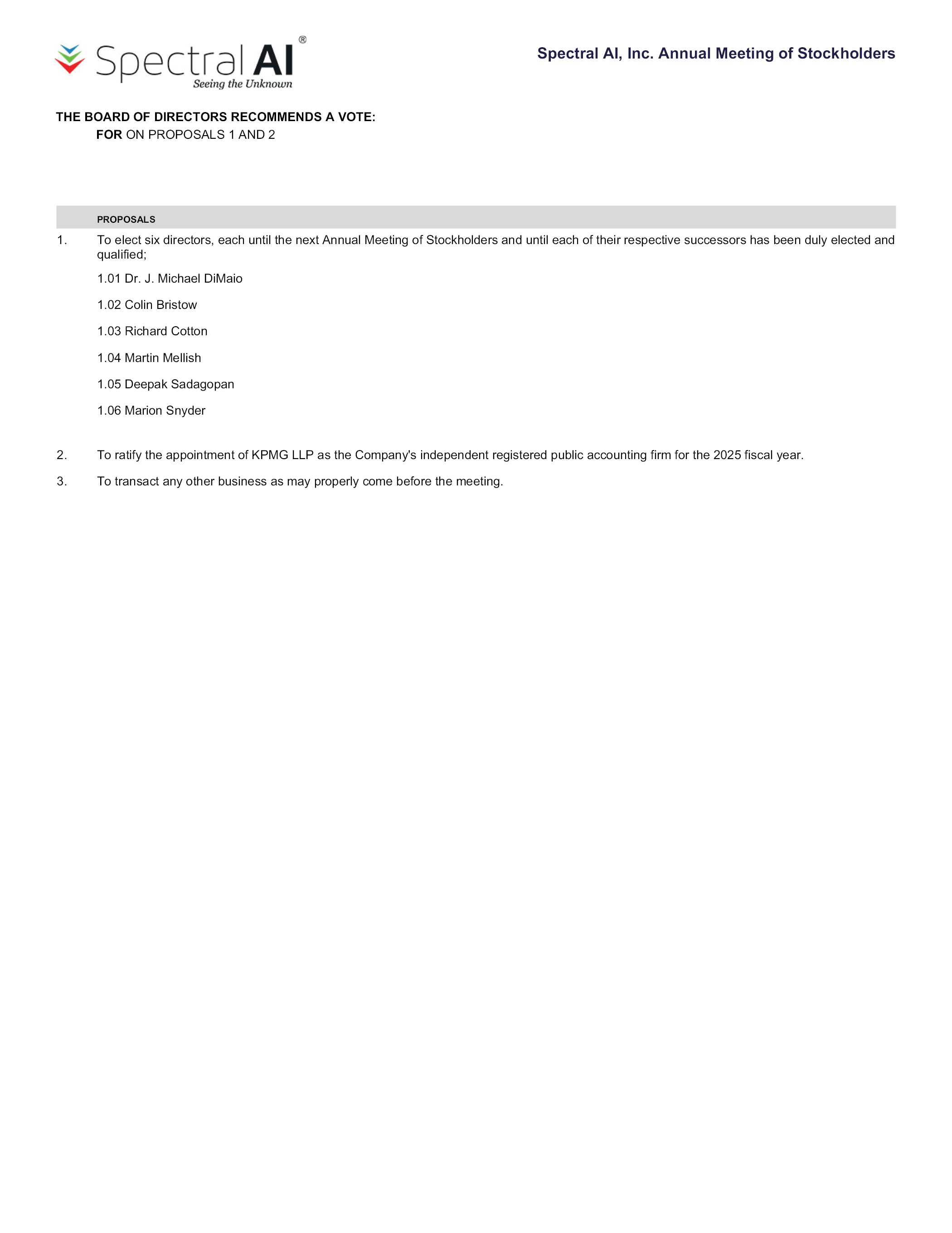 Spectral AI, Inc. Annual Meeting of Stockholders THE BOARD OF DIRECTORS RECOMMENDS A VOTE: FOR ON PROPOSALS 1 AND 2 PROPOSALS 1. To elect six directors, each until the next Annual Meeting of Stockholders and until each of their respective successors has been duly elected and qualified; 1.01 Dr. J. Michael DiMaio 1.02 Colin Bristow 1.03 Richard Cotton 1.04 Martin Mellish 1.05 Deepak Sadagopan 1.06 Marion Snyder 2. To ratify the appointment of KPMG LLP as the Company’s independent registered public accounting firm for the 2025 fiscal year. 3. To transact any other business as may properly come before the meeting.