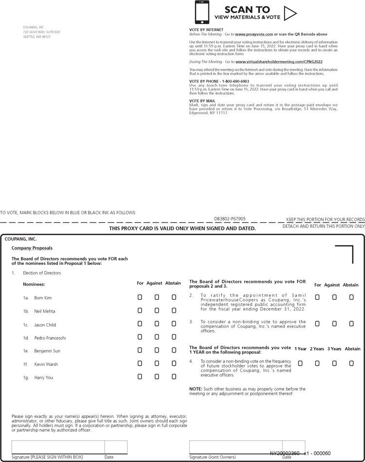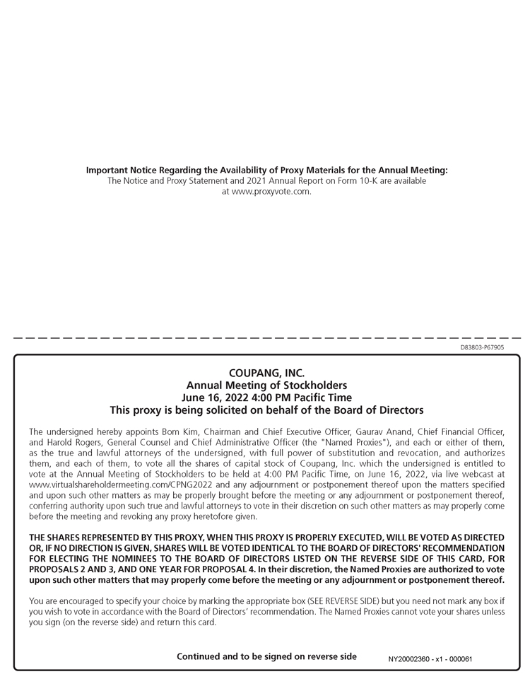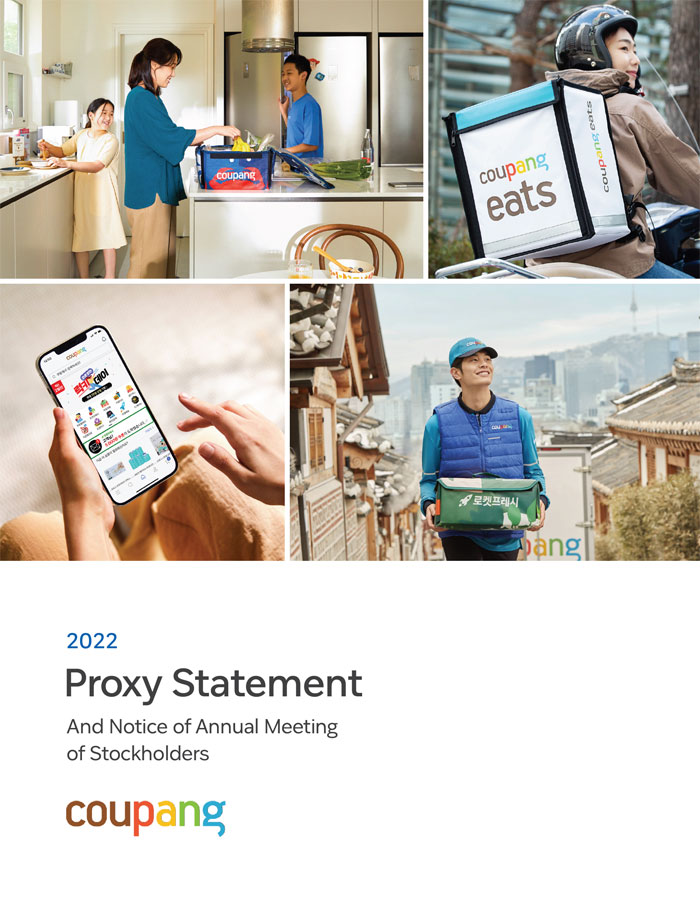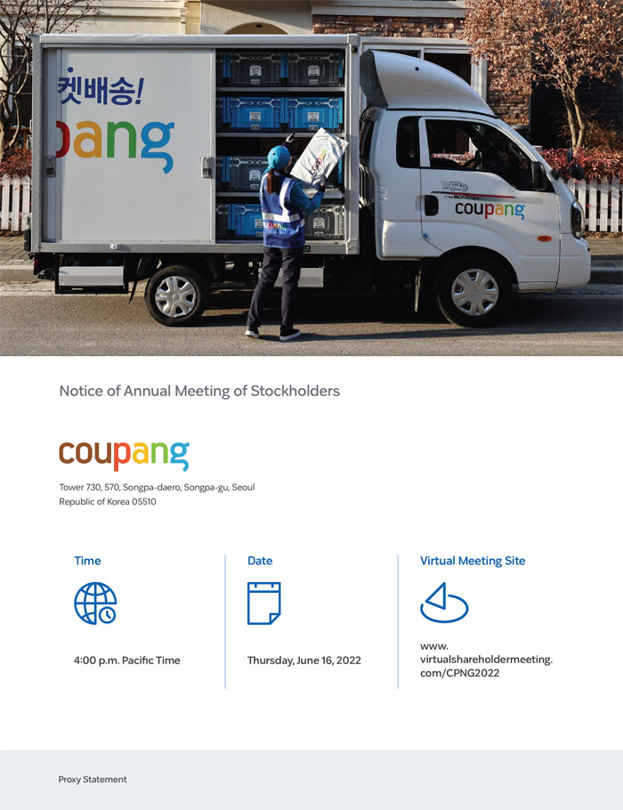 This proxy statement is being furnished in connection with the solicitation of proxies by the Board of Directors (the “Board”) of Coupang, Inc. (the “Company”, “Coupang”, “we” or “us”) for use at the Company’s 2022 Annual Meeting of Stockholders (the “Annual Meeting”). The Annual Meeting will be a completely virtual meeting, which will be conducted via live webcast. To attend and vote at the Annual Meeting, and view the list of registered stockholders as of the Record Date during the meeting, stockholders of record must access the meeting website at www.virtualshareholdermeeting.com/CPNG2022 and enter the 16-digit control number found on the Internet Notice or on the proxy card provided to you with this proxy statement. If your shares are held in street name through a broker, bank, trustee, or other nominee and your Internet Notice or voting instruction form indicates that you may vote those shares through the www.proxyvote.com website, then you may access and vote at the Annual Meeting with the 16-digit control number indicated on that Internet Notice or voting instruction form. Otherwise, stockholders who hold their shares in street name should contact their broker bank, trustee, or other nominee that holds their shares (preferably at least five days before the Annual Meeting) to obtain a legal proxy in order to be able to attend, participate in, or vote at the Annual Meeting.