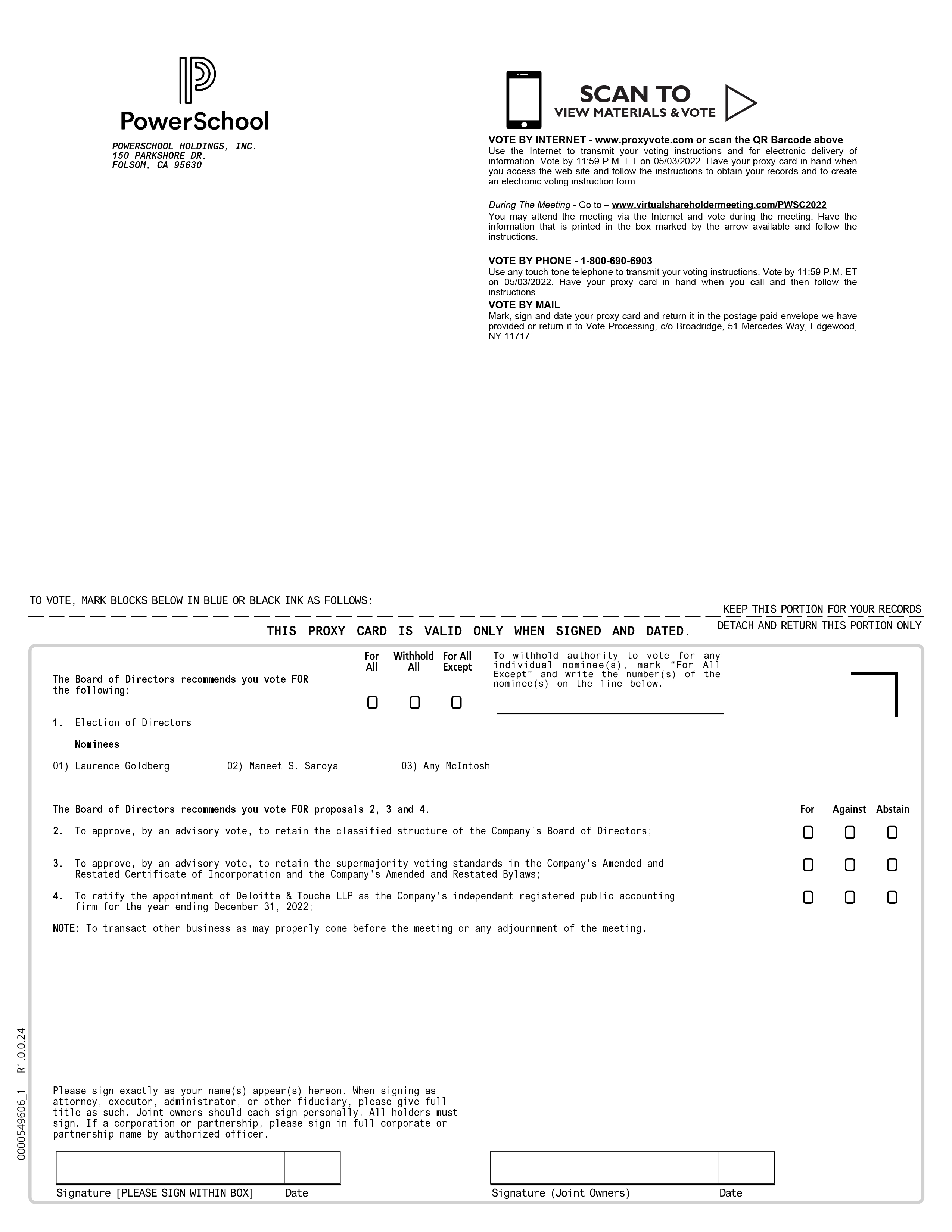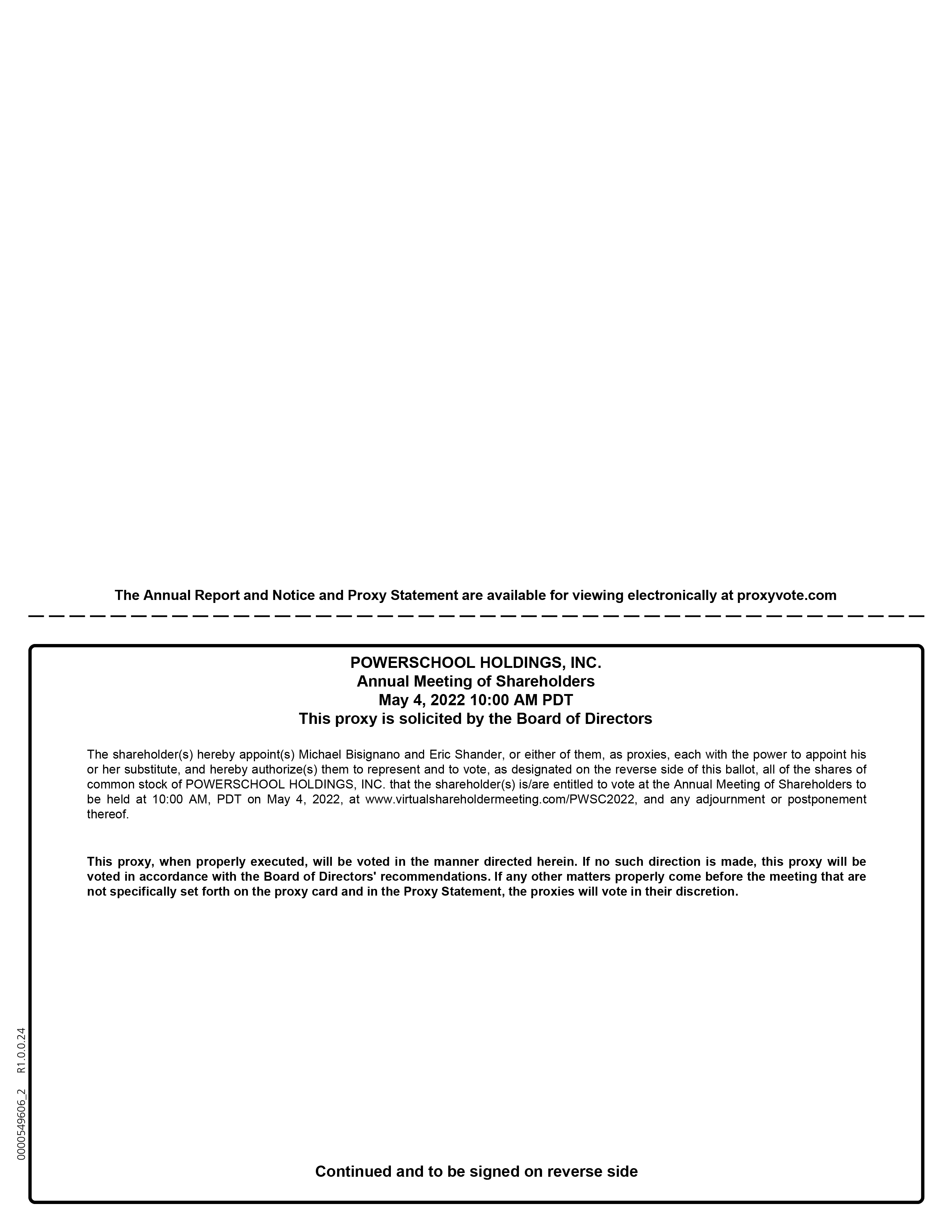We are pleased to invite you to attend our first Annual Meeting of Shareholders of PowerSchool Holdings, Inc. (“PowerSchool” or the “Company”) to be held on Wednesday, May 4, 2022, at 10:00 a.m. Pacific Time (the “Annual Meeting”). This year’s Annual Meeting will be conducted virtually, via live audio webcast. In light of continuing risks related to the COVID-19 pandemic, we think a virtual only meeting for this year is advisable to protect the health and well-being of the attendees. You will be able to attend the meeting online by visiting www.virtualshareholdermeeting.com/PWSC2022. You will be able to submit questions and vote your shares electronically during the meeting by logging in using the 16-digit control number included on your proxy card or on the voting instruction form accompanying these proxy materials.