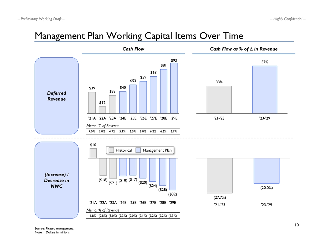 – Preliminary Working Draft – – Highly Confidential – Management Plan Expense And Spending Profile Over Time Spend ($mm) % of Revenue 15.4% 14.3% $152 $138 $126 $116 12.5% 12.4% $106 $98 12.1% $91 $86 $87 11.8% 11.5% Adjusted R&D 11.2% 10.9% '21A '22A '23A '24E '25E '26E '27E '28E '29E '21A '22A '23A '24E '25E '26E '27E '28E '29E 6.6% 6.4% 5.5% Capitalized 5.2% 5.0% 4.8% Product Dev. 4.5% $59 $52 $46 $49 $41 $44 4.3% 4.3% $39 $41 $36 Costs '21A '22A '23A '24E '25E '26E '27E '28E '29E '21A '22A '23A '24E '25E '26E '27E '28E '29E 15.7% 15.4% 15.0% $174 $192 14.6% $157 14.4% $143 14.1% $132 $122 13.8% $109 13.4% Adjusted S&M $80 $75 12.8% '21A '22A '23A '24E '25E '26E '27E '28E '29E '21A '22A '23A '24E '25E '26E '27E '28E '29E 10.0% 9.8% 8.9% 7.9% 6.7% Adjusted G&A 6.6% $81 $75 6.4% $70 $64 $63 $62 $62 6.1% $55 $59 5.8% '21A '22A '23A '24E '25E '26E '27E '28E '29E '21A '22A '23A '24E '25E '26E '27E '28E '29E 9 Source: Picasso management. Historical Management Plan Note: Dollars in millions.