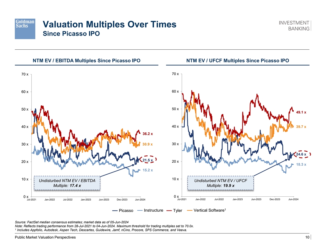 Picasso Indexed Stock Price Performance Since Picasso IPO 225 % Since IPO Performance (%) 1Y 6M YTD 3M 1M Picasso 24 % 18 % (4)% (6)% 10 % 34 % 200 % Instructure 18 (8) (16) (17) 5 14 Tyler (2) 21 18 16 16 3 Performance since IPO up to 1 Vertical Software 13 26 8 5 2 (0) undisturbed date (07-May-2024) 175 % (8) % 150 % 125 % 24 % 18 % 13 % 100 % (2)% 75 % 50 % 25 % 0 % Jul-2021 Nov-2021 Feb-2022 Jun-2022 Sep-2022 Jan-2023 Apr-2023 Aug-2023 Nov-2023 Feb-2024 Jun-2024 Source: FactSet, market data as 05-Jun-2024 Note: Since Picasso IPO as 28-Jul-2021. Picasso share price performance indexed to $18.00 per share. 1 Includes Appfolio, Autodesk, Aspen Tech, Descartes, Guidewire, Jamf, nCino, Procore, SPS Commerce, and Veeva. Public Market Valuation Perspectives 9 Indexed Share Price Performance