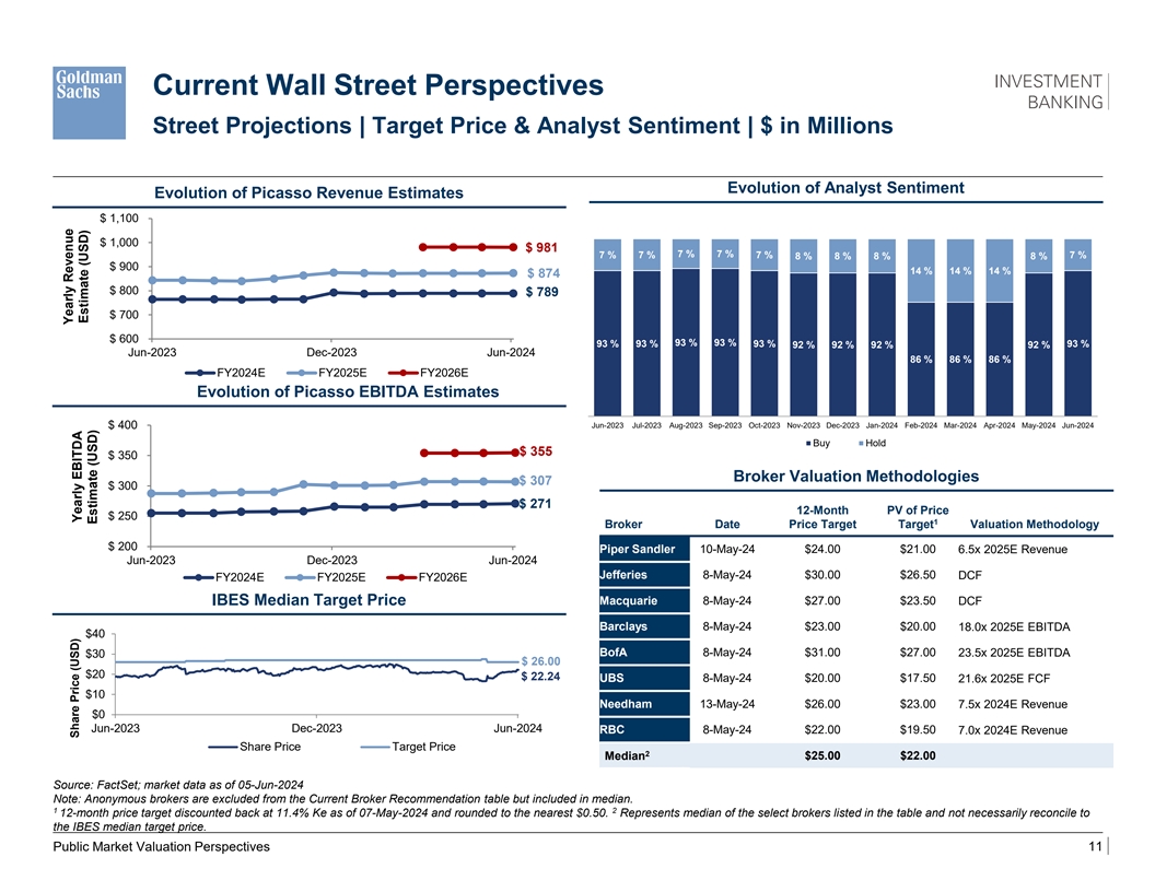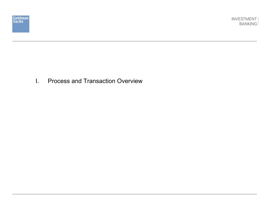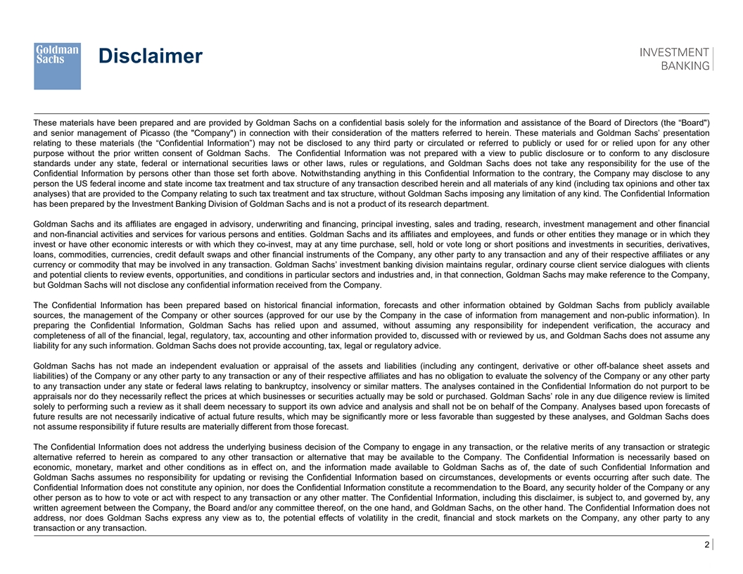 Disclaimer These materials have been prepared and are provided by Goldman Sachs on a confidential basis solely for the information and assistance of the Board of Directors (the “Board ) and senior management of Picasso (the Company ) in connection with their consideration of the matters referred to herein. These materials and Goldman Sachs’ presentation relating to these materials (the “Confidential Information”) may not be disclosed to any third party or circulated or referred to publicly or used for or relied upon for any other purpose without the prior written consent of Goldman Sachs. The Confidential Information was not prepared with a view to public disclosure or to conform to any disclosure standards under any state, federal or international securities laws or other laws, rules or regulations, and Goldman Sachs does not take any responsibility for the use of the Confidential Information by persons other than those set forth above. Notwithstanding anything in this Confidential Information to the contrary, the Company may disclose to any person the US federal income and state income tax treatment and tax structure of any transaction described herein and all materials of any kind (including tax opinions and other tax analyses) that are provided to the Company relating to such tax treatment and tax structure, without Goldman Sachs imposing any limitation of any kind. The Confidential Information has been prepared by the Investment Banking Division of Goldman Sachs and is not a product of its research department. Goldman Sachs and its affiliates are engaged in advisory, underwriting and financing, principal investing, sales and trading, research, investment management and other financial and non-financial activities and services for various persons and entities. Goldman Sachs and its affiliates and employees, and funds or other entities they manage or in which they invest or have other economic interests or with which they co-invest, may at any time purchase, sell, hold or vote long or short positions and investments in securities, derivatives, loans, commodities, currencies, credit default swaps and other financial instruments of the Company, any other party to any transaction and any of their respective affiliates or any currency or commodity that may be involved in any transaction. Goldman Sachs’ investment banking division maintains regular, ordinary course client service dialogues with clients and potential clients to review events, opportunities, and conditions in particular sectors and industries and, in that connection, Goldman Sachs may make reference to the Company, but Goldman Sachs will not disclose any confidential information received from the Company. The Confidential Information has been prepared based on historical financial information, forecasts and other information obtained by Goldman Sachs from publicly available sources, the management of the Company or other sources (approved for our use by the Company in the case of information from management and non-public information). In preparing the Confidential Information, Goldman Sachs has relied upon and assumed, without assuming any responsibility for independent verification, the accuracy and completeness of all of the financial, legal, regulatory, tax, accounting and other information provided to, discussed with or reviewed by us, and Goldman Sachs does not assume any liability for any such information. Goldman Sachs does not provide accounting, tax, legal or regulatory advice. Goldman Sachs has not made an independent evaluation or appraisal of the assets and liabilities (including any contingent, derivative or other off-balance sheet assets and liabilities) of the Company or any other party to any transaction or any of their respective affiliates and has no obligation to evaluate the solvency of the Company or any other party to any transaction under any state or federal laws relating to bankruptcy, insolvency or similar matters. The analyses contained in the Confidential Information do not purport to be appraisals nor do they necessarily reflect the prices at which businesses or securities actually may be sold or purchased. Goldman Sachs’ role in any due diligence review is limited solely to performing such a review as it shall deem necessary to support its own advice and analysis and shall not be on behalf of the Company. Analyses based upon forecasts of future results are not necessarily indicative of actual future results, which may be significantly more or less favorable than suggested by these analyses, and Goldman Sachs does not assume responsibility if future results are materially different from those forecast. The Confidential Information does not address the underlying business decision of the Company to engage in any transaction, or the relative merits of any transaction or strategic alternative referred to herein as compared to any other transaction or alternative that may be available to the Company. The Confidential Information is necessarily based on economic, monetary, market and other conditions as in effect on, and the information made available to Goldman Sachs as of, the date of such Confidential Information and Goldman Sachs assumes no responsibility for updating or revising the Confidential Information based on circumstances, developments or events occurring after such date. The Confidential Information does not constitute any opinion, nor does the Confidential Information constitute a recommendation to the Board, any security holder of the Company or any other person as to how to vote or act with respect to any transaction or any other matter. The Confidential Information, including this disclaimer, is subject to, and governed by, any written agreement between the Company, the Board and/or any committee thereof, on the one hand, and Goldman Sachs, on the other hand. The Confidential Information does not address, nor does Goldman Sachs express any view as to, the potential effec