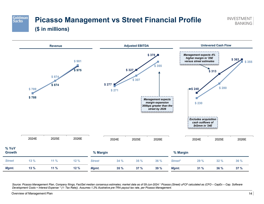 Picasso Historical and Projected Financial Profile ($ in millions) Historical Picasso Management Plan CAGR 2021A 2022A 2023A 2024E 2025E 2026E 2027E 2028E 2029E 21-23A 24-29E Revenue $ 559 $ 631 $ 698 $ 788 $ 874 $ 975 $ 1,093 $ 1,231 $ 1,392 12 % 12 % YoY Growth 13 % 11 % 13 % 11 % 12 % 12 % 13 % 13 % Adjusted EBITDA $ 161 $ 196 $ 232 $ 277 $ 327 $ 378 $ 439 $ 513 $ 595 20 % 17 % YoY Growth 22 % 18 % 19 % 18 % 16 % 16 % 17 % 16 % % Margin 29 % 31 % 33 % 35 % 37 % 39 % 40 % 42 % 43 % Unlevered Free Cash Flow $ 170 $ 146 $ 204 $ 206 $ 313 $ 365 $ 428 $ 475 $ 540 9 % 21 % YoY Growth (14)% 39 % 1 % 52 % 16 % 17 % 11 % 14 % % uFCF Conversion 106 % 74 % 88 % 75 % 96 % 96 % 97 % 93 % 91 % Source: Picasso Management Plan Overview of Management Plan 13