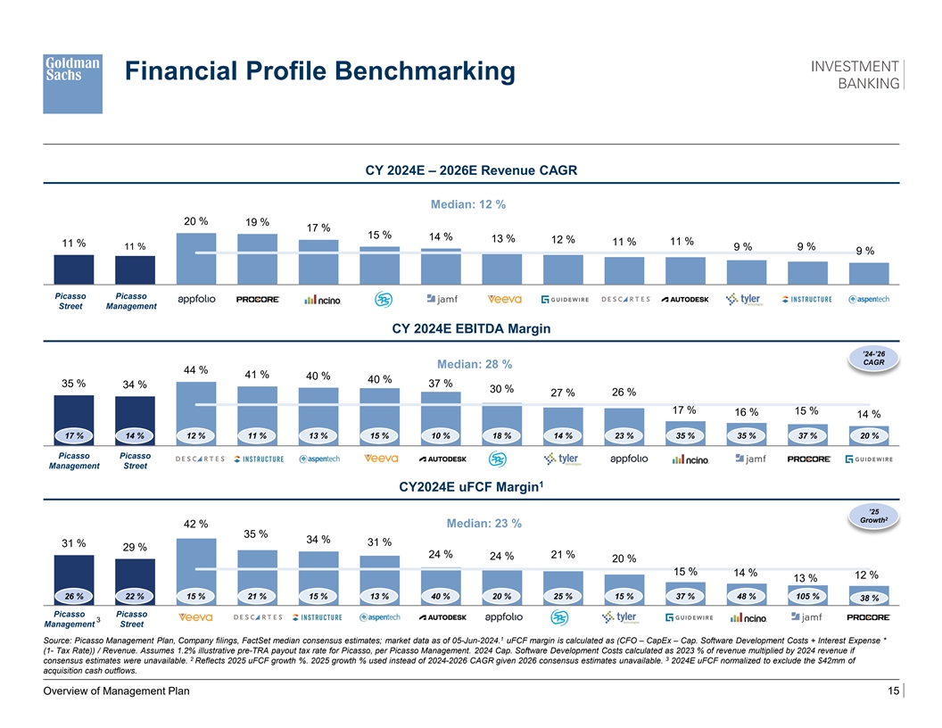 Picasso Management vs Street Financial Profile ($ in millions) Unlevered Cash Flow Revenue Adjusted EBITDA Management expects 4% $ 378 higher margin in ‘25E $ 363 $ 981 versus street estimates $ 355 $ 355 $ 327 $ 975 $ 313 $ 874 $ 307 $ 277 $ 874 $ 280 $ 248 $ 789 $ 271 $ 788 Management expects margin expansion $ 230 300bps greater than the street by 2026 Excludes acquisition cash outflows of $42mm in ‘24E 2024E 2025E 2026E 2024E 2025E 2026E 2024E 2025E 2026E % YoY Growth % Margin % Margin 1 Street 13 % 11 % 12 % Street 34 % 35 % 36 % Street 29 % 32 % 36 % Mgmt. 13 % 11 % 12 % Mgmt. 35 % 37 % 39 % Mgmt. 31 % 36 % 37 % 1 Source: Picasso Management Plan, Company filings, FactSet median consensus estimates; market data as of 05-Jun-2024. Picasso (Street) uFCF calculated as (CFO – CapEx – Cap. Software Development Costs + Interest Expense * (1- Tax Rate)). Assumes 1.2% illustrative pre-TRA payout tax rate, per Picasso Management. Overview of Management Plan 14