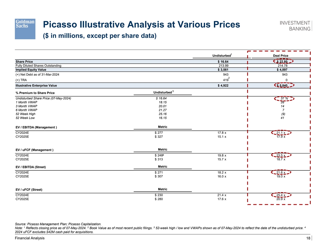Picasso Illustrative Analysis at Various Prices ($ in millions, except per share data) 1 Undisturbed Deal Price Share Price $ 16.64 $ 22.80 Fully Diluted Shares Outstanding 213.99 214.78 Implied Equity Value $ 3,561 $ 4,897 (+) Net Debt as of 31-Mar-2024 943 943 2 (+) TRA 419 0 Illustrative Enterprise Value $ 4,922 $ 5,840 3 Undisturbed % Premium to Share Price Undisturbed Share Price (07-May-2024) $ 16.64 37 % 1 Month VWAP 18.15 26 3 Month VWAP 20.01 14 6 Month VWAP 21.27 7 52 Week High 25.16 (9) 52 Week Low 16.15 41 Metric EV / EBITDA (Management ) CY2024E $ 277 17.8 x 21.1 x CY2025E $ 327 15.1 x 17.9 x Metric EV / uFCF (Management ) 4 CY2024E $ 248 19.8 x 23.5 x CY2025E $ 313 15.7 x 18.7 x Metric EV / EBITDA (Street) CY2024E $ 271 18.2 x 21.6 x CY2025E $ 307 16.0 x 19.0 x Metric EV / uFCF (Street) CY2024E $ 230 21.4 x 25.4 x CY2025E $ 280 17.6 x 20.9 x Source: Picasso Management Plan; Picasso Capitalization. 1 2 3 4 Note: Reflects closing price as of 07-May-2024. Book Value as of most recent public filings. 52-week high / low and VWAPs shown as of 07-May-2024 to reflect the date of the undisturbed price. 2024 uFCF excludes $42M cash paid for acquisitions. Financial Analysis 18