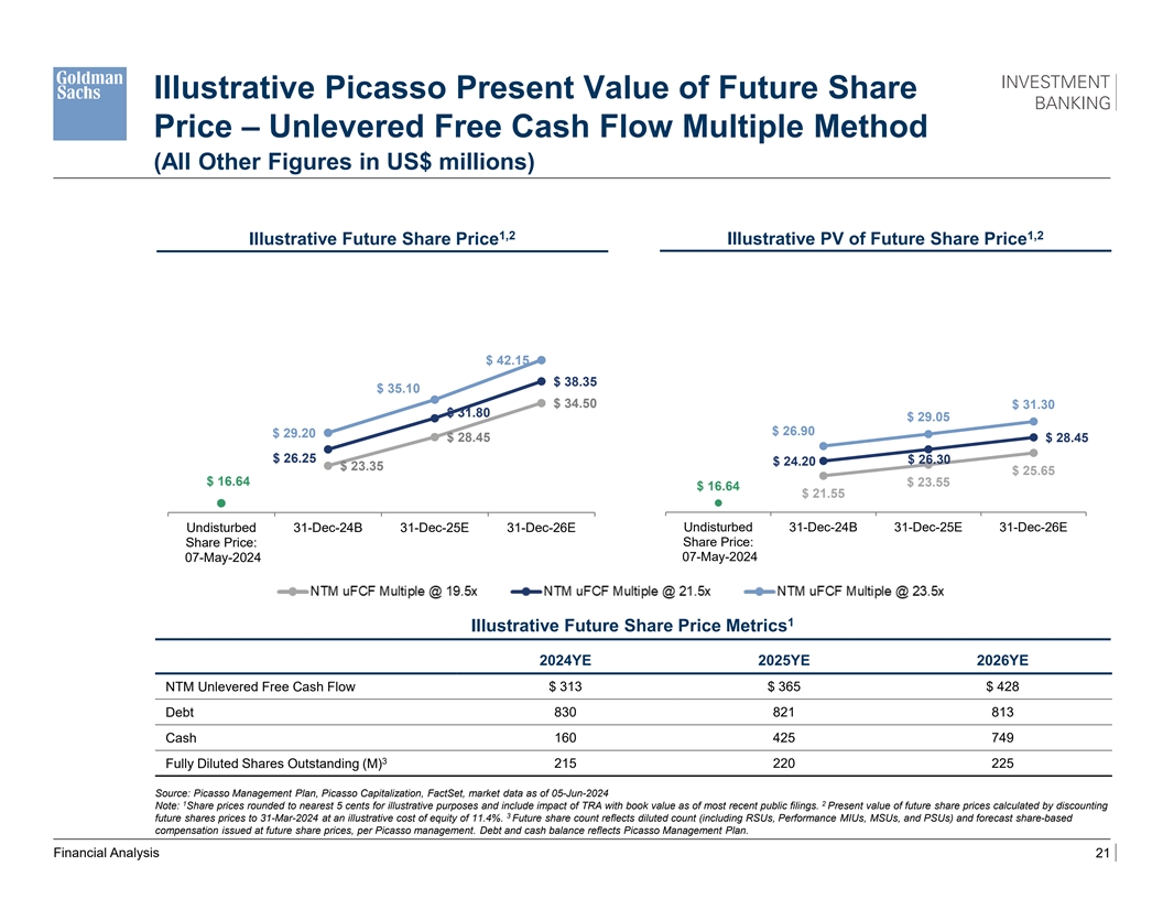 Illustrative Picasso Present Value of Future Share Price – EBITDA Multiple Method (All Other Figures in US$ millions) 1,2 1,2 Illustrative Future Share Price Illustrative PV of Future Share Price $ 36.50 $ 30.50 $ 32.55 $ 27.10 $ 25.35 $ 25.25 $ 28.65 $ 23.35 $ 24.20 $ 27.05 $ 22.40 $ 20.55 $ 23.65 $ 22.30 $ 16.64 $ 21.30 $ 16.64 $ 19.55 $ 17.75 $ 19.25 Undisturbed 31-Dec-24B 31-Dec-25E 31-Dec-26E Undisturbed 31-Dec-24B 31-Dec-25E 31-Dec-26E Share Price: Share Price: 07-May-2024 07-May-2024 NTM EBITDA Multiple @ 16.0x NTM EBITDA Multiple @ 18.0x NTM EBITDA Multiple @ 20.0x 1 Illustrative Future Share Price Metrics 2024YE 2025YE 2026YE NTM EBITDA $ 327 $ 378 $ 439 Debt 830 821 813 160 425 749 Cash 3 Fully Diluted Shares Outstanding (M) 215 220 225 Source: Picasso Management Plan, Picasso Capitalization, FactSet, market data as of 05-Jun-2024 1 2 Note: Share prices rounded to nearest 5 cents for illustrative purposes and include impact of TRA with book value as of most recent public filings. Present value of future share prices calculated by discounting 3 future shares prices to 31-Mar-2024 at an illustrative cost of equity of 11.4%. Future share count reflects diluted count (including RSUs, Performance MIUs, MSUs, and PSUs) and forecast share-based compensation issued at future share prices, per Picasso management. Debt and cash balance reflects Picasso Management Plan. Financial Analysis 20