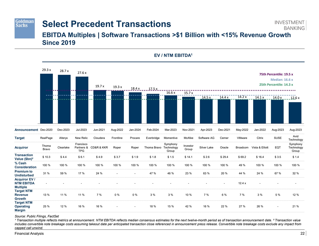 Select Precedent Transactions EBITDA Multiples | Software Transactions >$1 Billion with <15% Revenue Growth Since 2019 1 EV / NTM EBITDA 29.3 x 28.7 x 27.6 x 75th Percentile: 19.5 x Median: 16.6 x 25th Percentile: 14.3 x 19.7 x 19.3 x 18.4 x 17.5 x 16.6 x 15.7 x 14.2 x 14.5 x 14.4 x 14.1 x 14.0 x 12.6 x Dec-2020 Dec-2023 Jul-2023 Jun-2021 Aug-2022 Jan-2024 Feb-2024 Mar-2023 Nov-2021 Apr-2023 Dec-2021 May-2022 Jan-2022 Aug-2023 Aug-2023 Announcement Avid Target RealPage Alteryx New Relic Cloudera Frontline Procare Everbridge Momentive McAfee Software AG Cerner VMware Citrix SUSE Technology Francisco Symphony Symphony Thoma Investor Clearlake Partners & CD&R & KKR Roper Roper Thoma Bravo Technology Silver Lake Oracle Broadcom Vista & Elliott EQT Technology Acquiror Bravo Group TPG Group Group Transaction $ 10.3 $ 4.4 $ 6.1 $ 4.9 $ 3.7 $ 1.9 $ 1.8 $ 1.5 $ 14.1 $ 2.6 $ 29.4 $ 69.2 $ 16.4 $ 3.5 $ 1.4 Value ($bn)² % Cash 100 % 100 % 100 % 100 % 100 % 100 % 100 % 100 % 100 % 100 % 100 % 49 % 100 % 100 % 100 % Consideration Premium to 31 % 59 % 17 % 24 % - - 47 % 46 % 23 % 63 % 20 % 44 % 24 % 67 % 32 % Undisturbed Acquiror EV / - - - - - - - - - - - 12.4 x - - - NTM EBITDA Multiple Target NTM 13 % 11 % 11 % 7 % 0 % 0 % 3 % 3 % 10 % 7 % 6 % 7 % 3 % 5 % 12 % Revenue Growth Target NTM Operating 25 % 12 % 16 % 16 % - - 18 % 15 % 42 % 16 % 22 % 27 % 26 % - 21 % Margin Source: Public Filings, FactSet ¹ Transaction multiple reflects metrics at announcement. NTM EBITDA reflects median consensus estimates for the next twelve-month period as of transaction announcement date. ² Transaction value includes convertible note breakage costs assuming takeout date per anticipated transaction close referenced in announcement press release. Convertible note breakage costs exclude any impact from capped call unwind. Financial Analysis 22