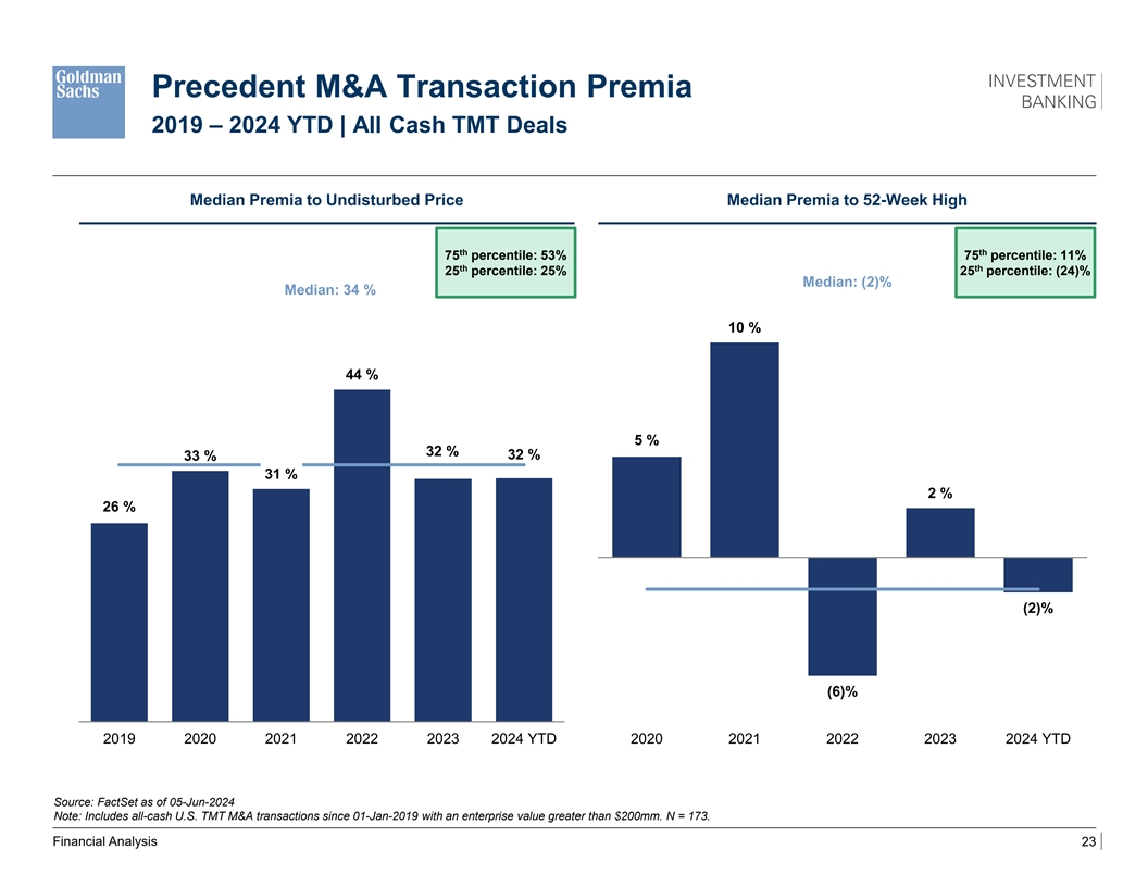 Precedent M&A Transaction Premia 2019 – 2024 YTD | All Cash TMT Deals Median Premia to Undisturbed Price Median Premia to 52-Week High th th 75 percentile: 53% 75 percentile: 11% th th 25 percentile: 25% 25 percentile: (24)% Median: (2)% Median: 34 % 10 % 44 % 5 % 32 % 32 % 33 % 31 % 2 % 26 % (2)% (6)% 2019 2020 2021 2022 2023 2024 YTD 2020 2021 2022 2023 2024 YTD Source: FactSet as of 05-Jun-2024 Note: Includes all-cash U.S. TMT M&A transactions since 01-Jan-2019 with an enterprise value greater than $200mm. N = 173. Financial Analysis 23