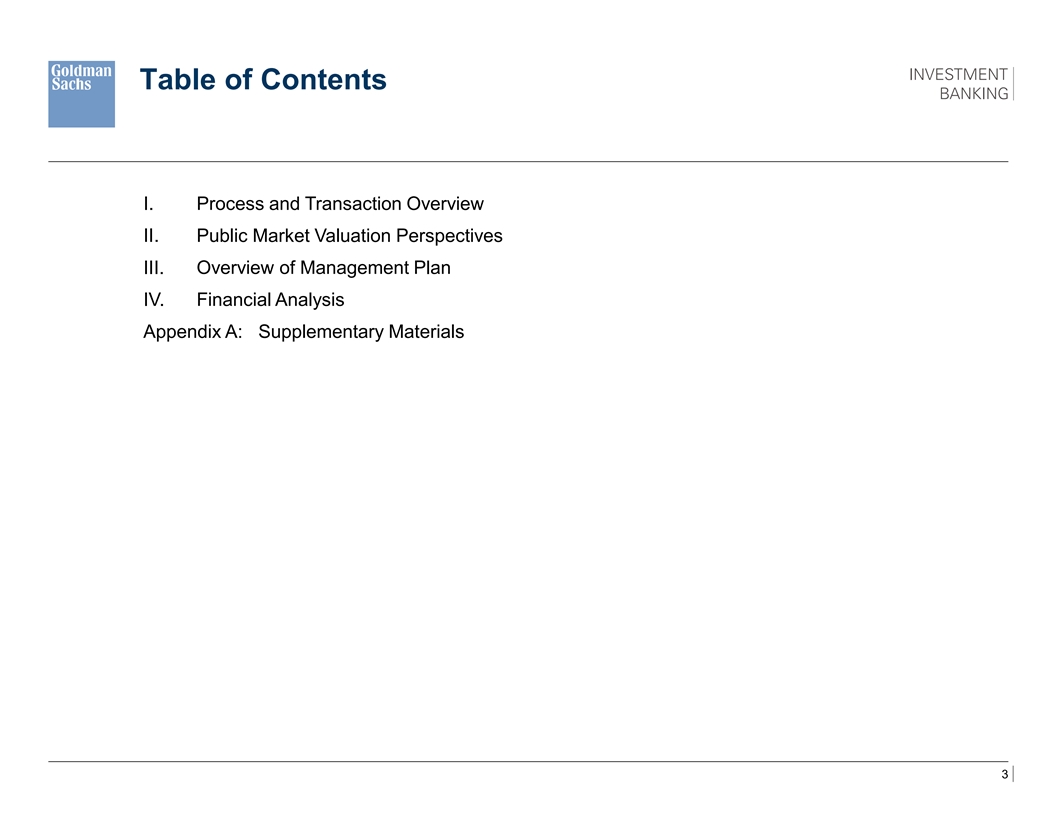 Table of Contents I. Process and Transaction Overview II. Public Market Valuation Perspectives III. Overview of Management Plan IV. Financial Analysis Appendix A: Supplementary Materials 3