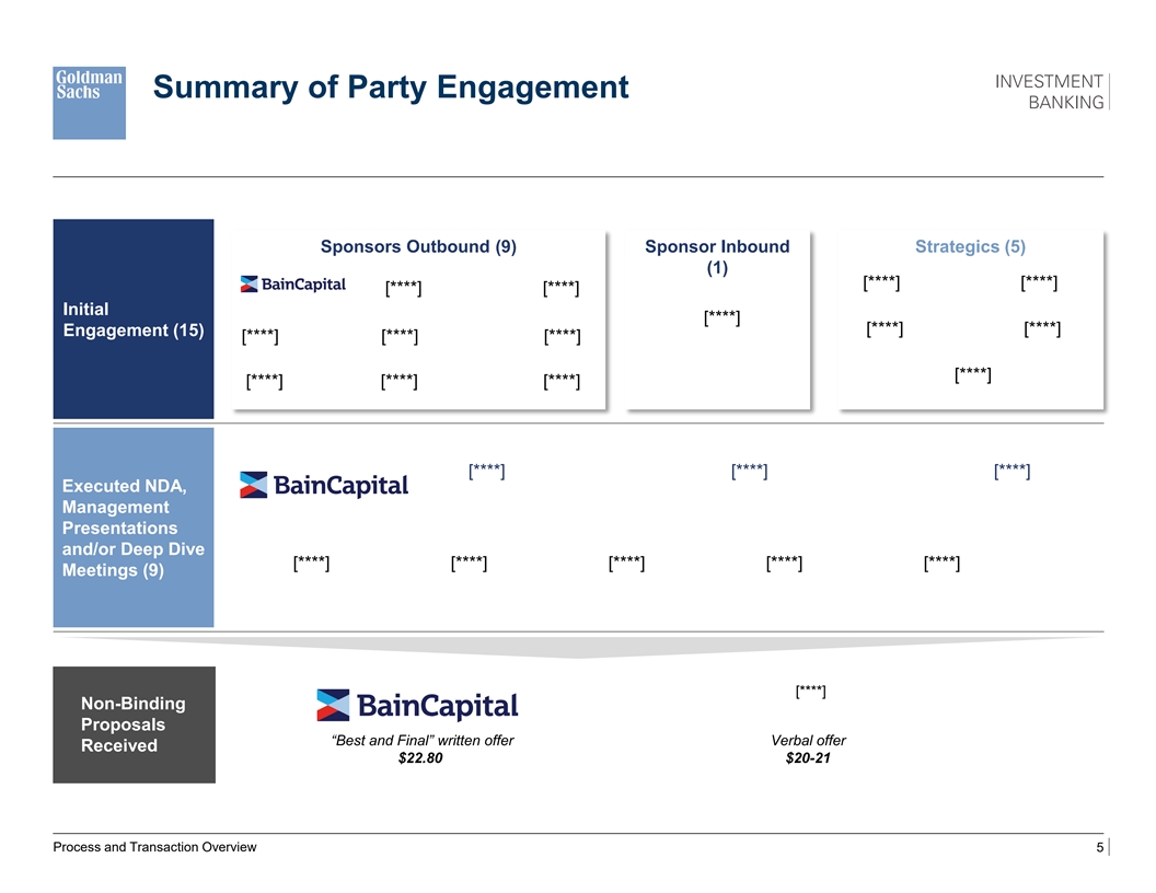 Summary of Party Engagement Sponsors Outbound (9) Sponsor Inbound Strategics (5) (1) [****] [****] [****] [****] Initial [****] [****] [****] Engagement (15) [****] [****] [****] [****] [****] [****] [****] [****] [****] [****] Executed NDA, Management Presentations and/or Deep Dive [****] [****] [****] [****] [****] Meetings (9) [****] Non-Binding Proposals “Best and Final” written offer Verbal offer Received $22.80 $20-21 Process and Transaction Overview 5