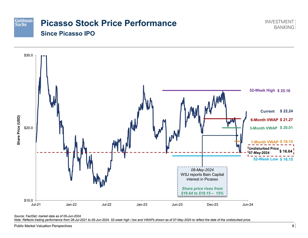 Picasso Illustrative Analysis at Various Prices ($ in millions, except per share data) 1 Undisturbed Deal Price Share Price $ 16.64 $ 22.80 Fully Diluted Shares Outstanding 213.99 214.78 Implied Equity Value $ 3,561 $ 4,897 (+) Net Debt as of 31-Mar-2024 943 943 2 (+) TRA 419 0 Illustrative Enterprise Value $ 4,922 $ 5,840 3 Undisturbed % Premium to Share Price Undisturbed Share Price (07-May-2024) $ 16.64 37 % 1 Month VWAP 18.15 26 3 Month VWAP 20.01 14 6 Month VWAP 21.27 7 52 Week High 25.16 (9) 52 Week Low 16.15 41 Metric EV / EBITDA (Management ) CY2024E $ 277 17.8 x 21.1 x CY2025E $ 327 15.1 x 17.9 x Metric EV / uFCF (Management ) 4 CY2024E $ 248 19.8 x 23.5 x CY2025E $ 313 15.7 x 18.7 x Metric EV / EBITDA (Street) CY2024E $ 271 18.2 x 21.6 x CY2025E $ 307 16.0 x 19.0 x Metric EV / uFCF (Street) CY2024E $ 230 21.4 x 25.4 x CY2025E $ 280 17.6 x 20.9 x Source: Financial forecasts for Picasso prepared by the Picasso Management and approved by Picasso for Goldman Sachs’ use (“Picasso Management Plan”). Note: Fully diluted shares outstanding represents deal price of $22.80 according to the 04-Jun-2024 equity capitalization, calculated using treasury stock method consisting of common shares of 203,742,206, performance MIUs of 2,704,549 with a weighted average participation threshold of $12.11, restricted share units (“RSU”) of 8,207,817, market share units (“MSU”) of 555,775 issued on 25- Mar-2023 with a strike price of $19.48, MSUs of 404,784 issued on 01-Apr-2024 with a strike price of $20.90, performance share units (“PSU”) of 537,799 issued on 01-Apr-2024, net debt of $1,362M as of 31-Mar-2024, comprised of gross debt of $961M, tax receivable agreement (“TRA”) of $419M, and cash and cash equivalents of $17M, all, as provided by Picasso Management or obtained from 1 2 Picasso most recent public filings, and approved by Picasso for Goldman Sachs’ use collectively defined as “Picasso Capitalization”. Reflects closing price as of 07-May-2024. Book Value as of most 3 4 recent public filings. 52-week high / low and VWAPs shown as of 07-May-2024 to reflect the date of the undisturbed price. 2024 uFCF excludes $42M cash paid for acquisitions. Process and Transaction Overview 6